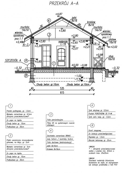Technologia tradycyjna , ściany zewnętrzne murowane grubości 30 cm, działowe gr. 12 cm. Wszystkie ściany wykonane z pustaków ceramicznych "POROTHERM". Konstrukcja więźby dachowej drewniana, pokrycie dachówka ceramiczna. Istnieje mozliwośc adaptacji obiektu na budynek całoroczny - docieplenie warstwą styropianu gr. 10 cm.
