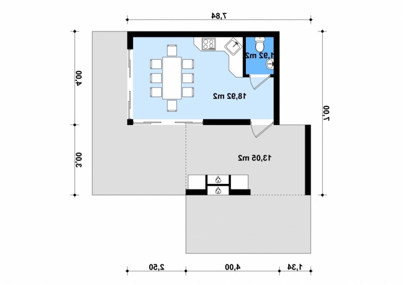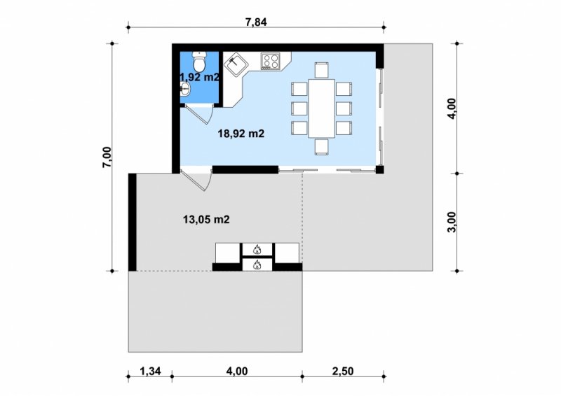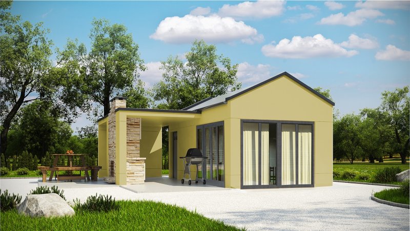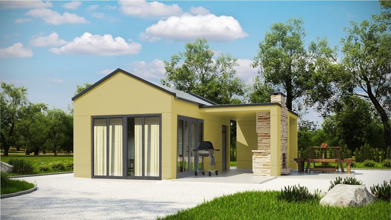 Projekt budynku rekreacyjnego, parterowego, niepodpiwniczonego, z pokojem wypoczynkowym, aneksem kuchennym i łazienką. Do projektu dołączone jest zestawienie: stali, więźby dachowej oraz stolarki drzwiowej, jak równieżbezpłatna zgoda na dokonanie zmian.