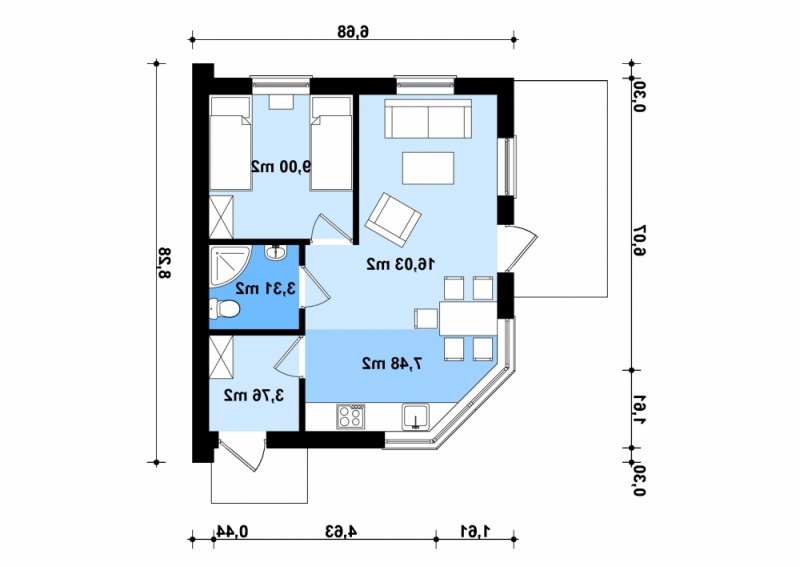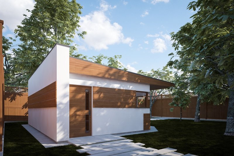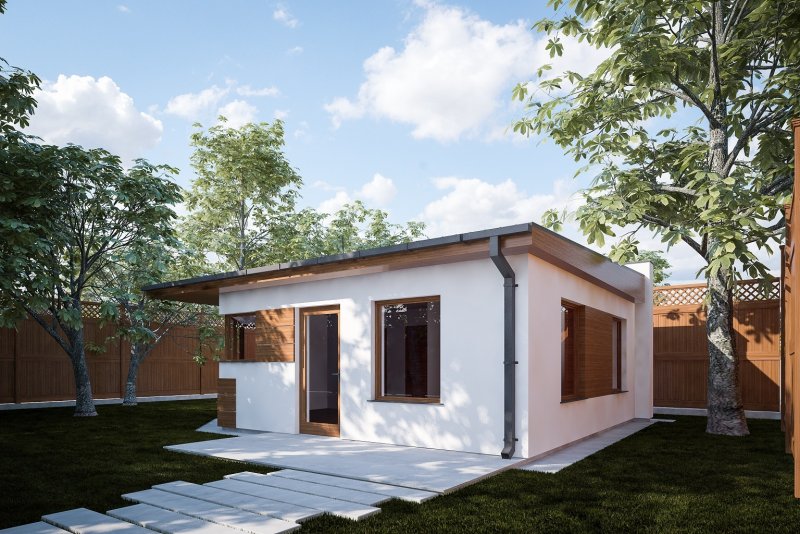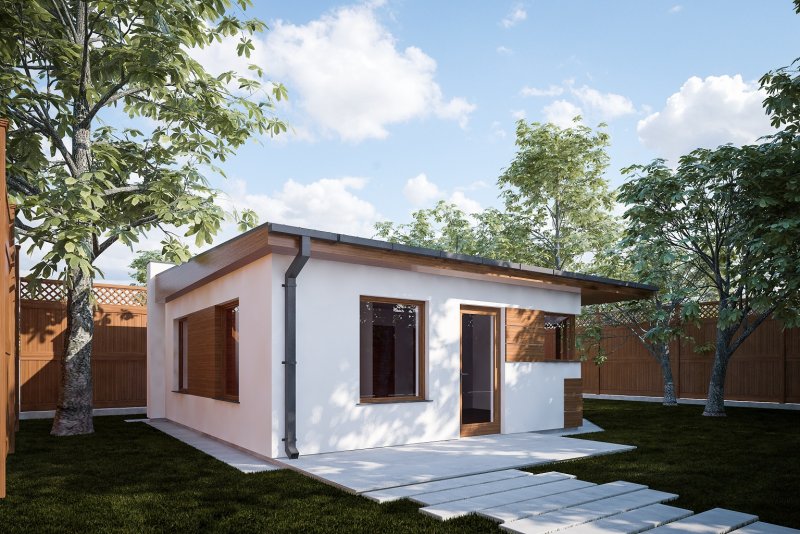 Projekt budynku letniskowego, parterowego, niepodpiwniczonego, z pokojem wypoczynkowym, aneksem kuchennym, pokojem sypialnym i łazienką. Do projektu dołączone jest zestawienie: stali, więźby dachowej oraz stolarki drzwiowej, jak równieżbezpłatna zgoda na dokonanie zmian.