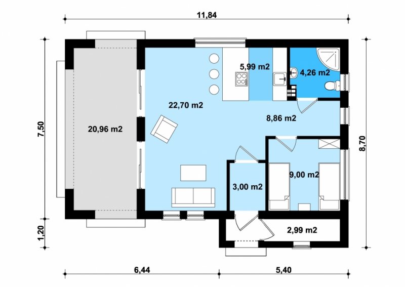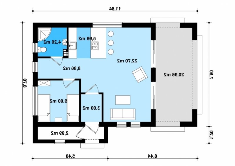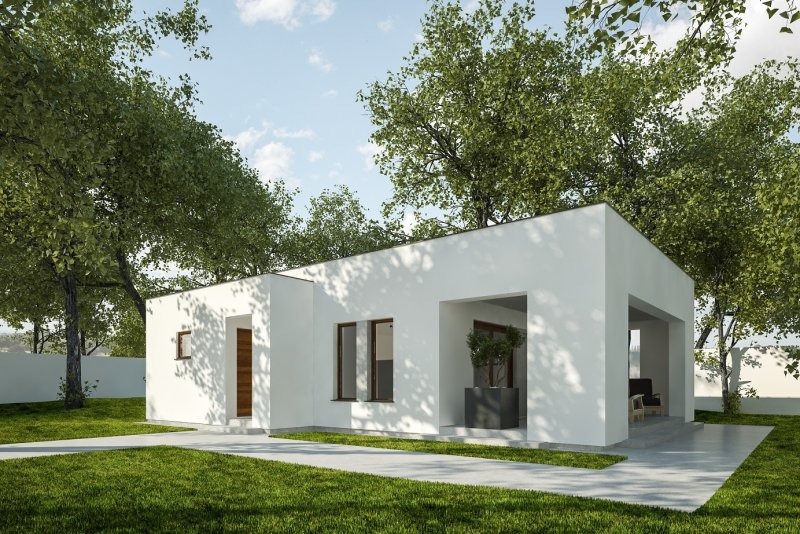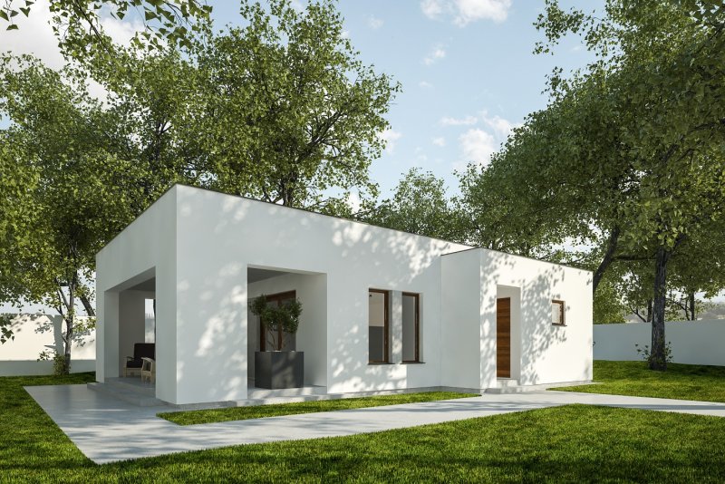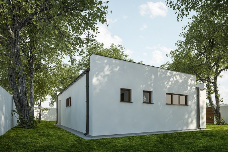 Projekt budynku letniskowego, parterowego, niepodpiwniczonego, z pokojem wypoczynkowym, aneksem kuchennym, pokojem sypialnym, łazienką i pomieszczeniem gospodarczym. Do projektu dołączone jest zestawienie: stali, więźby dachowej oraz stolarki drzwiowej, jak również bezpłatna zgoda na dokonanie zmian.
