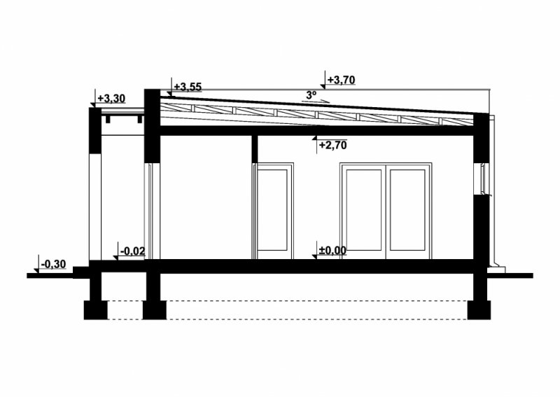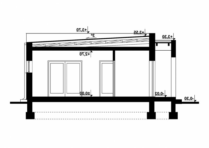 Budynek wykonany w technologii tradycyjnej. Ściany warstwowe grubości 34cm, murowane z bloczków z betonu komórkowego grubości 24cm, ocieplone styropianem grubości 10cm. Ściany wewnętrzne z betonu komórkowego grubości 12cm. Więźba dachowa jednospadowa, drewniana z wiązarów kratowych łączonych płytkami kolczastymi, pokryta blachą na rąbek.