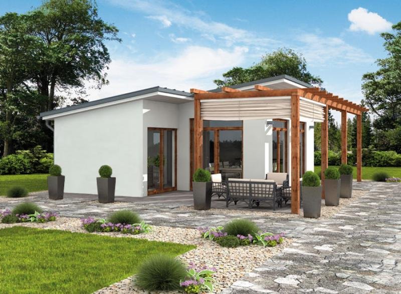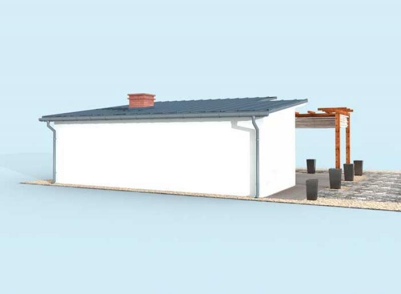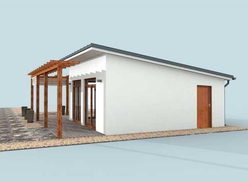 Składa się na niego przestronny salon z kominkiem, część sypialna, jadalnia z aneksem kuchennym, z niewielkim pomieszczeniem pomocniczym, łazienka i pomieszczenie gospodarcze z wejściem od zewnątrz. Przestrzeń w tym wariancie zagospodarowana jest tak, jakby przeznaczona była minimum dla dwojga osób. Pomieszczenie gospodarcze może pełnić wiele funkcji, być składem na drewno, może służyć przechowywaniu narzędzi ogrodowych a nawet zimowaniu roślin.