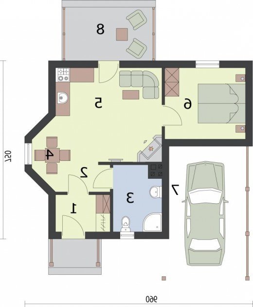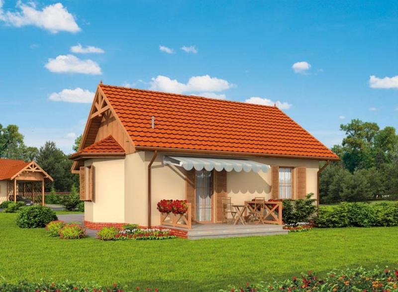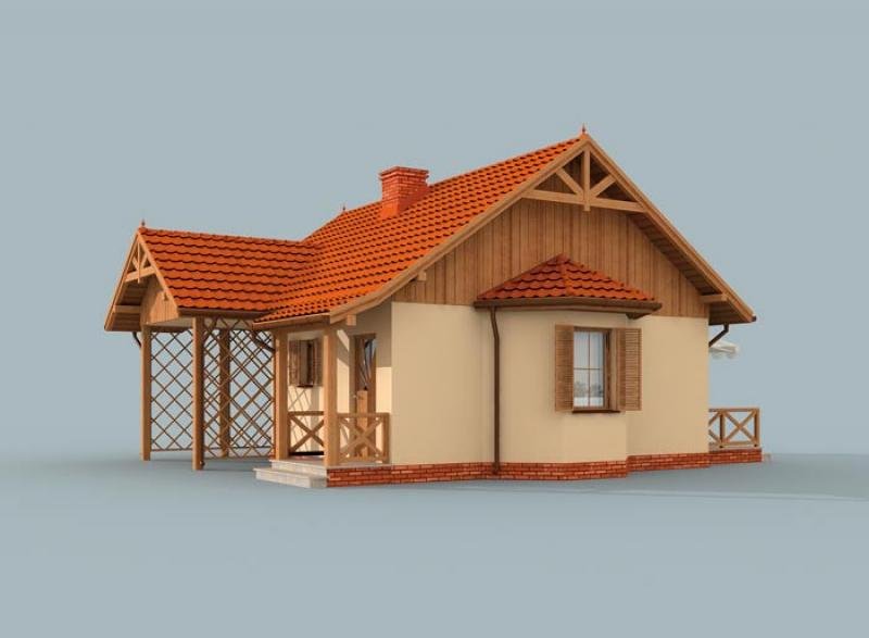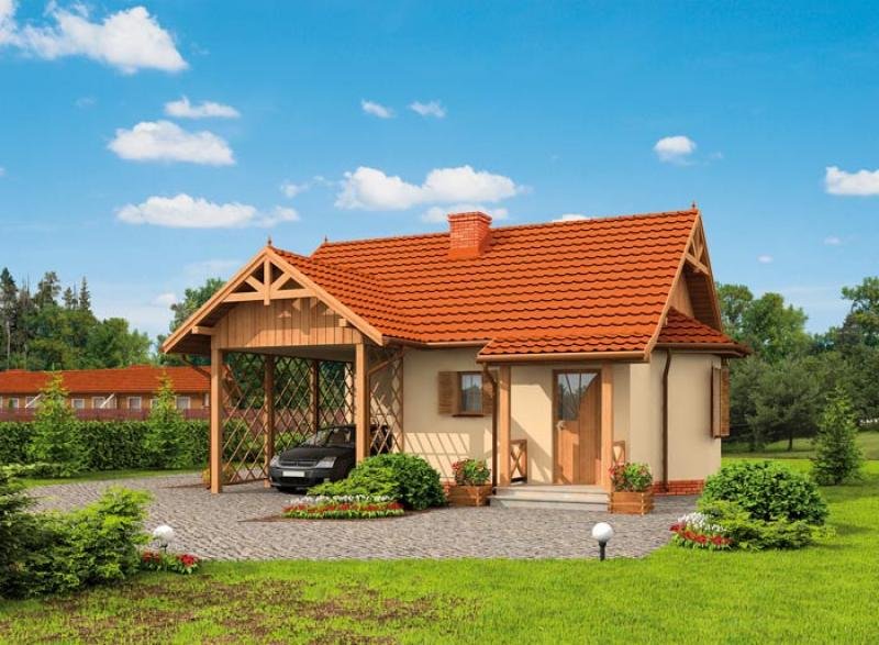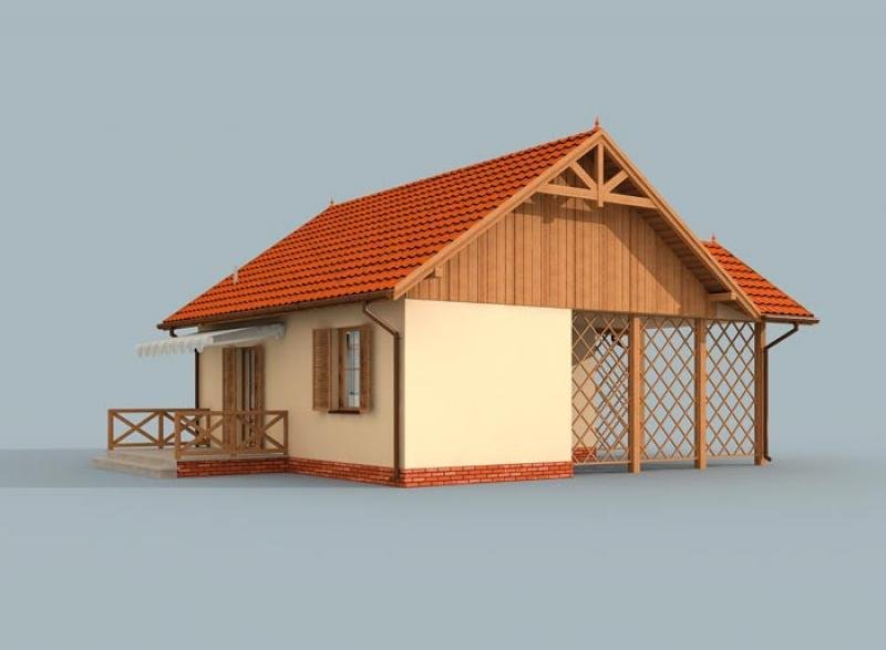 Gdyby spróbować wskazać pierwsze myśli, jakie łączą się z nazwą Kolorado, to z pewnością w wielu przypadkach byłyby to samowystarczalność i schronienie. Podobnie jest z naszym projektem o tej samej nazwie: bezpieczeństwo i kompleksowe rozwiązania Kolorado tworzą pełną czaru oraz stylu budowlę. Odeskowanie, zwieńczenia dachu, jętki, drewniane okiennice oraz zwracający uwagę wykusz decydują o eleganckim a zarazem sielskim charakterze domu. Od południa znajduje się ganek oraz wiata i to one dzięki ciekawym drewnianym zdobieniom przykuwają uwagę. Gdy dobrze się przyjrzymy, to można zauważyć, że od wschodu w bryle budynku znajduje się wypust, to wykusz, który skrywa jadalnię. Po przejściu przez ganek, w wiatrołapie znajdziemy miejsce na garderobę pod zabudowę. Dalej, po przejściu do komunikacji, jej lewa część wiedzie do kuchni, zaś po prawej jest wspomniana jadalnia. Za nią znajduje się największe pomieszczenie, czyli pokój dzienny z aneksem kuchennym, kominkiem. Całości wnętrz dopełnia sypialnia. Z pokoju dziennego można wyjść na taras, który będzie miejscem niejednej biesiady w gronie bliskich, letniego śniadania, czy romantycznej kolacji.