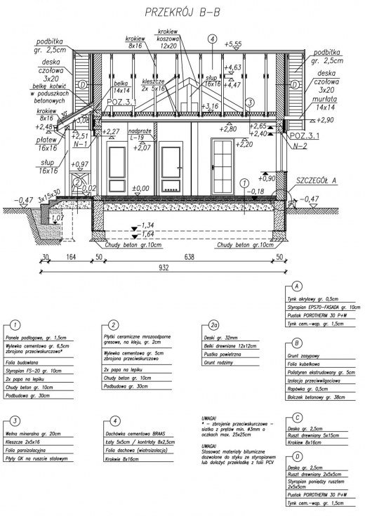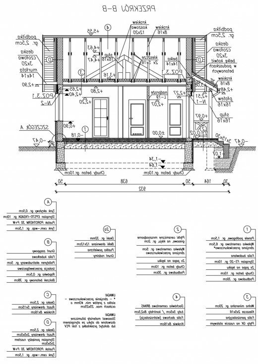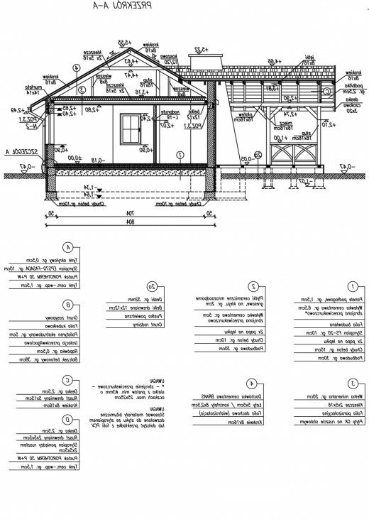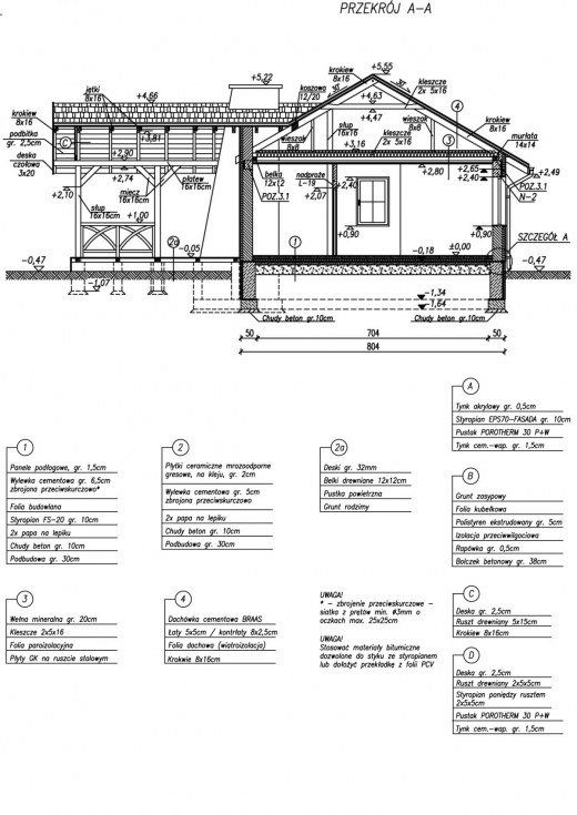 Technologia tradycyjna , ściany zewnętrzne murowane grubości 30 cm + 10 cm styropian, ściany wewnętrzne (nośne) gr. 25 cm i działowe gr. 12 cm. Wszystkie ściany wykonane z pustaków ceramicznych POROTHERM. Konstrukcja więźby dachowej drewniana, pokrycie dachówka ceramiczna.