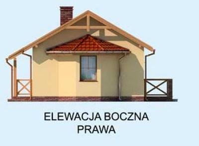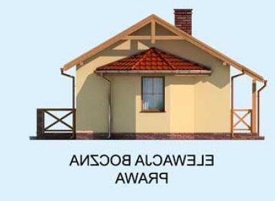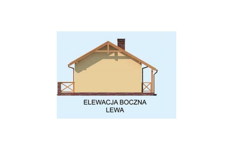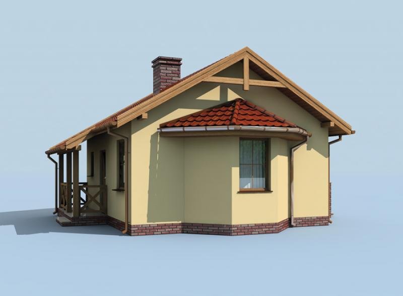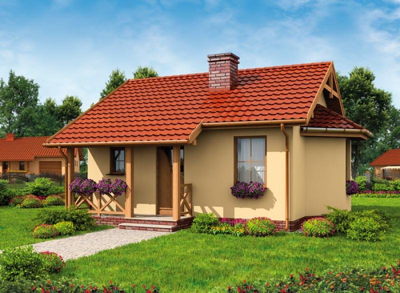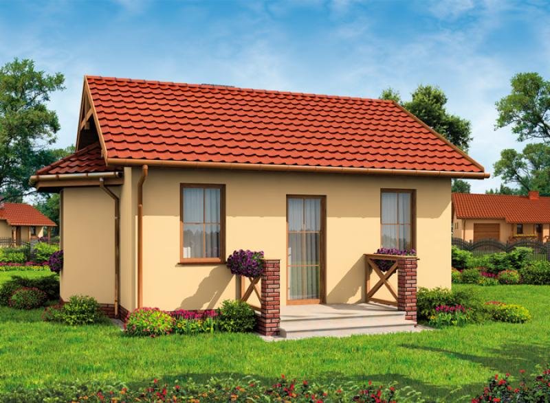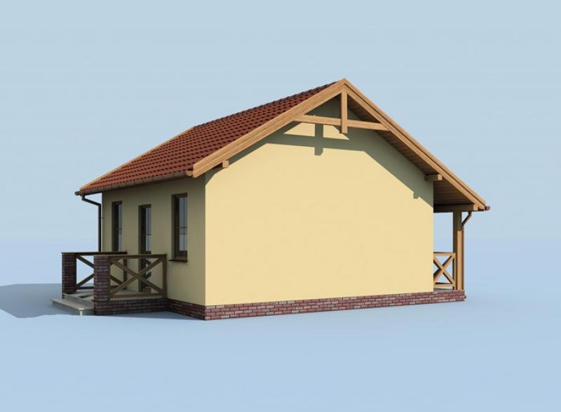 Jest to projekt, który może być ziszczeniem marzeń o zacisznym domku, w którym można spędzać leniwe, ciepłe, letnie dni. Idealny dla par w każdym wieku, będzie przestrzenią, która sprzyja miłości. Zadaszony ganek zaprasza do środka, po wejściu do niewielkiego wiatrołapu, po lewej znajduje się łazienka z oknem, którą można wyposażyć w prysznic, a nawet wannę. Dalej znajduje się największe pomieszczenie domu, salon, połączony z aneksem kuchennym. Z obszernego salonu, dobrze doświetlonego trzema oknami, można wyjść na taras. Będzie on z pewnością miejscem niejednej romantycznej kolacji oraz jakiejkolwiek uroczystości. W domku jest jeden pokój, w którym można usytuować dwa łóżka. Ten projekt może być idealnym wyborem dla emerytów, których dzieci opuściły już rodzinny dom, szukających czegoś przytulnego i skromnego na lata emerytury. Znakomicie sprawdzi się też w przypadku każdej pary.