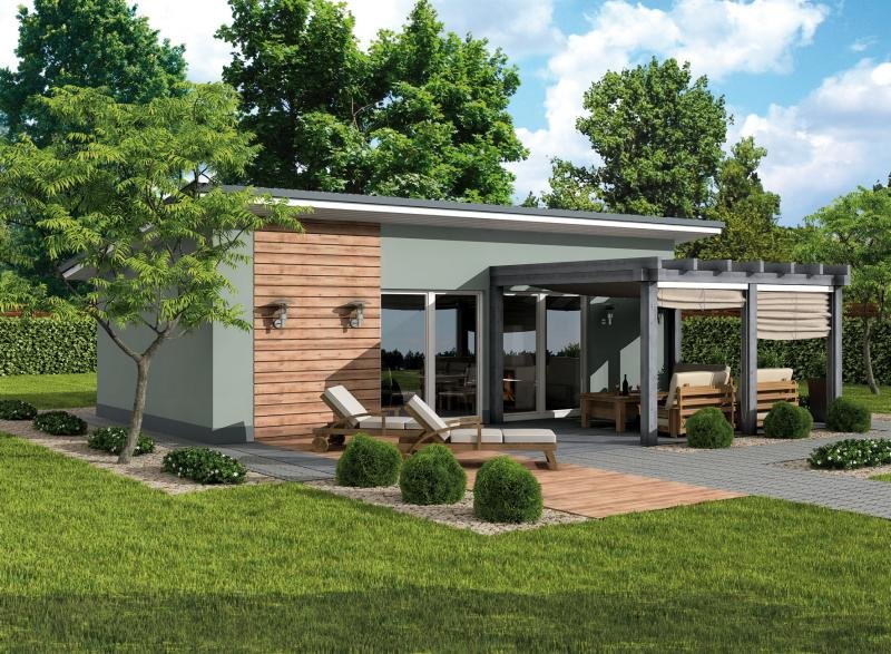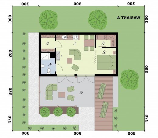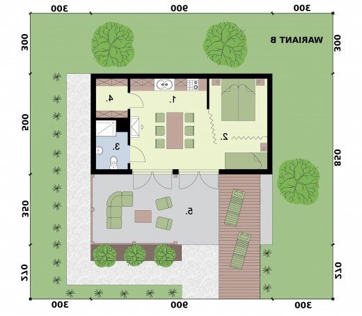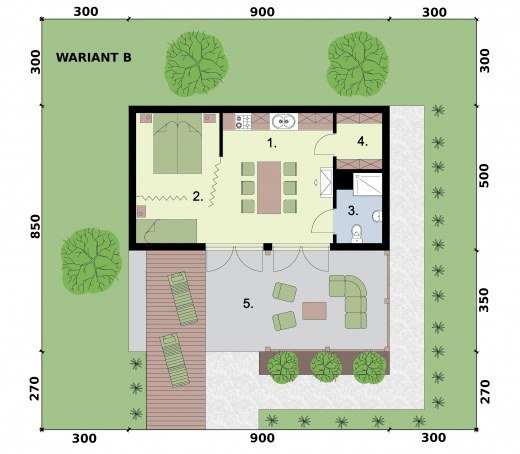 Składa się na niego salon z aneksem kuchennym, częścią sypialną i garderobą na zachodniej stonie, łazienką i pomieszczeniem gospodarczym na wschodniej. Punktem centralnym domku jest kominek usytuowany w salonie, znajdująca się tam sofa może być oczywiście rozkładana. Przestrzeń w tym wariancie zagospodarowana jest tak, jakby przeznaczona była minimum dla dwojga osób.