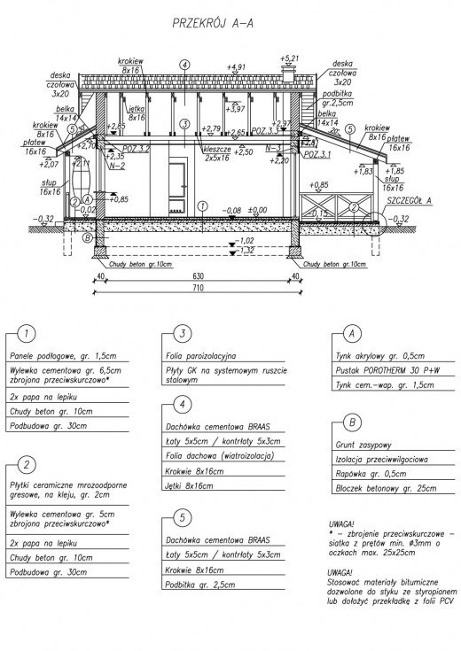 Technologia tradycyjna , ściany zewnętrzne murowane grubości 30 cm, działowe gr. 12 cm. Wszystkie ściany wykonane z pustaków ceramicznych "POROTHERM". Konstrukcja więźby dachowej drewniana, pokrycie dachówka ceramiczna. Istnieje mozliwośc adaptacji obiektu na budynek całoroczny - docieplenie warstwą styropianu gr. 10 cm.