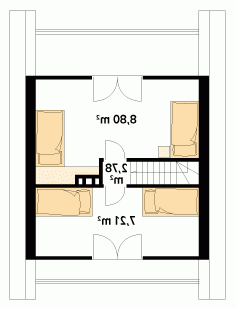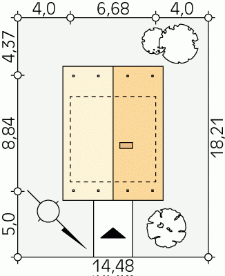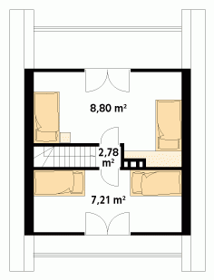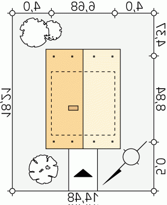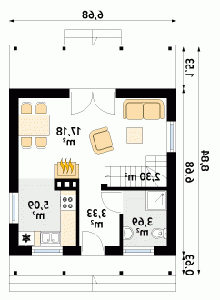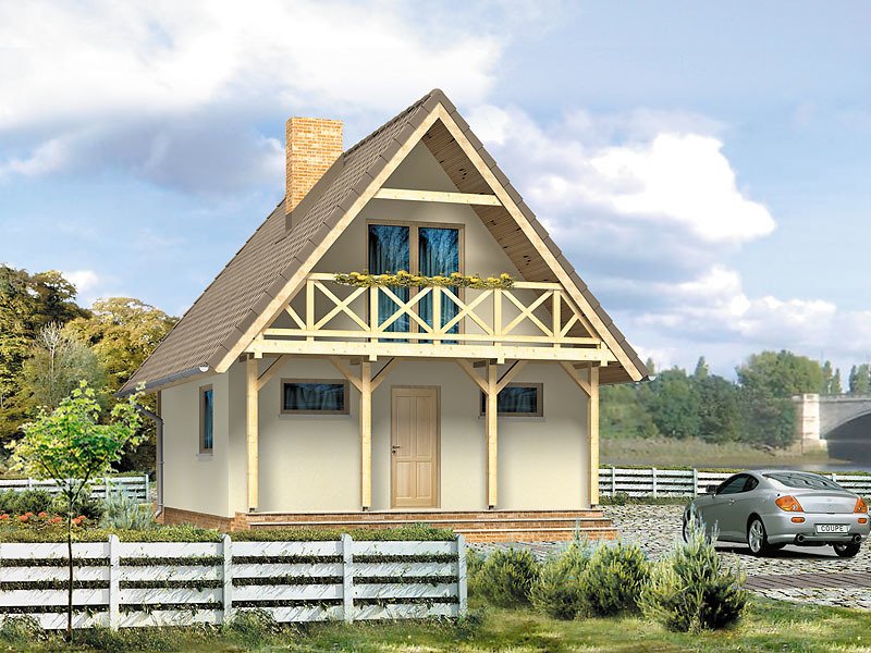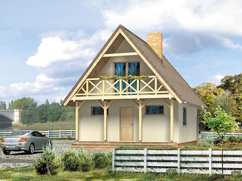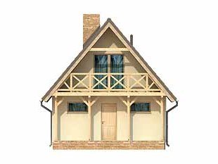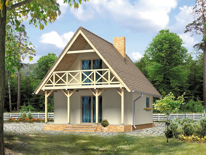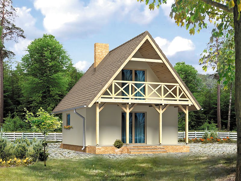 Niewielki dom letniskowy na planie kwadratu z tarasami przy ścianach szczytowych. Budynek o prostej konstrukcji, łatwy w budowie. Funkcjonalny układ wnętrza. Możliwość ogrzewania kominkiem.