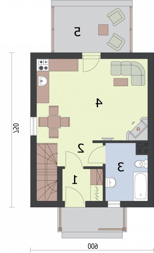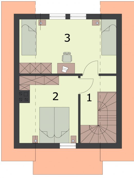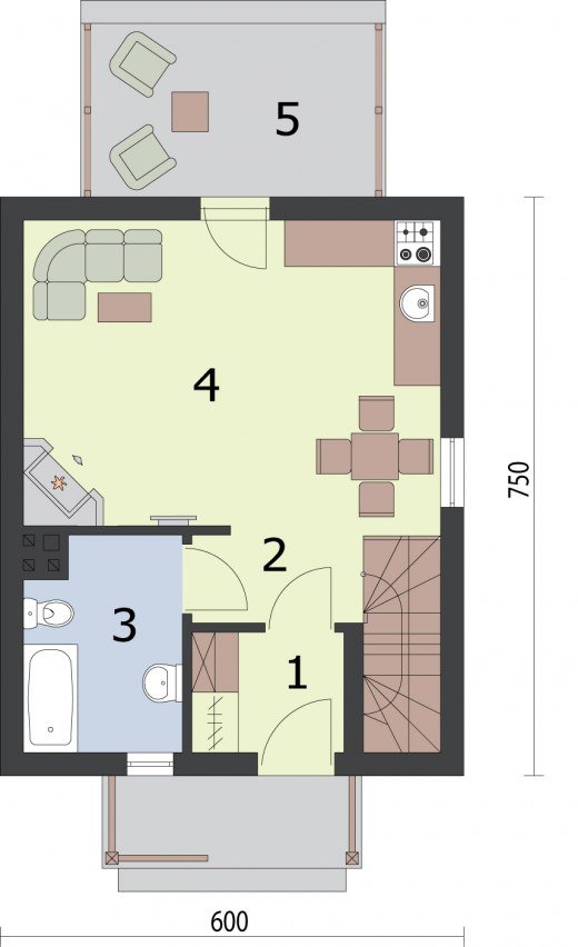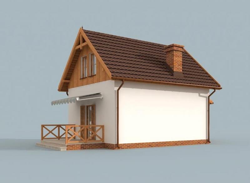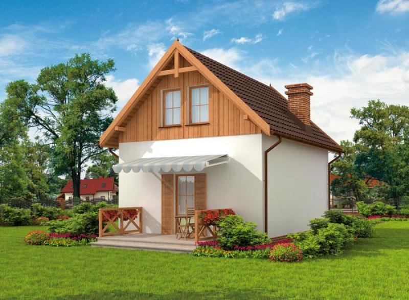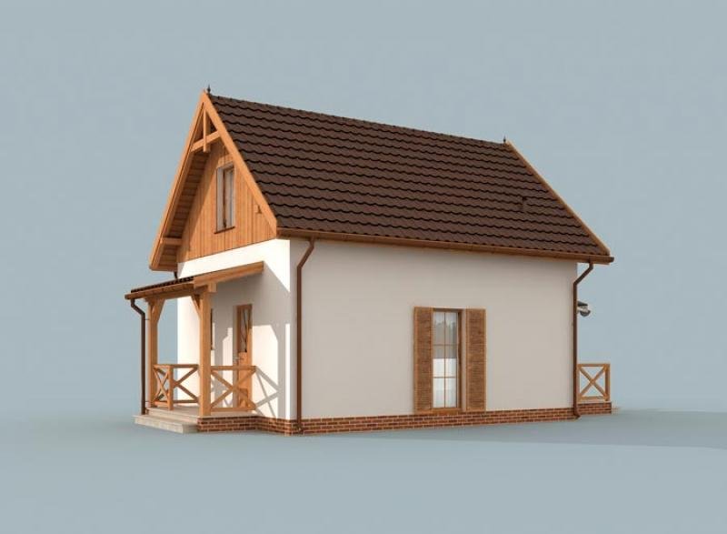 OKLAHOMA - dom letniskowy Projektu Oklahoma podobnie jak stanu o tej samej nazwie nie da się z niczym innym pomylić. Oklahoma wyróżnia się indywidualnym charakterem, to przykład rasowego, praktycznego budownictwa. Gustowne i nadające sielskiego charakteru elewacje wykończone drewnianymi elementami przykuwają uwagę. Są one tylko zapowiedzią dla racjonalnie zaplanowanych wnętrz. Piękno zewnętrzne i wewnętrzne uporządkowanie będą ważnym argumentem dla tych z Inwestorów, którzy widzieliby w nim ciepły, przyjazny dom letniskowy dla rodzin i nie tylko. Zadaszona weranda wiedzie do środka, w wiatrołapie znajdziemy miejsce na szafę pod zabudowę. Zaś po wyjściu z niego, po lewej usytuowano w pełni wyposażoną łazienkę, natomiast po prawej schody wiodące na piętro. Na wprost od komunikacji widoczny jest dwufunkcyjny pokój dzienny z kominkiem oraz aneksem kuchennym. Z tego przestronnego pokoju można wyjść na taras. Jest on dużym udogodnieniem i niewątpliwą zaletą mogącą przekonać tych, którzy cenią biesiady oraz celebrowanie wspólnych posiłków na świeżym powietrzu. Na piętrze znajdują się dwie dość obszerne sypialnie, doświetlone przez znajdujące się na ich południowych i północnych ścianach okna.