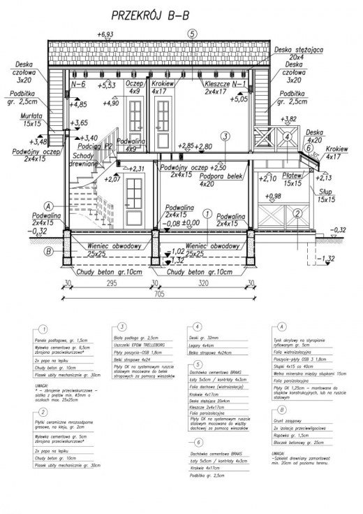 Technologia szkieletu drewnianego: - ściany zewnętrzne : słupki 4x15 rozstawione max. co 40cm obite zewnątrz płytą OSB 3 1,8cm , a wewnątrz płytą GK 1,25cm , przestrzeń pomiędzy słupkami wypełniona wełną mineralną 15cm - ściana wewnętrzna działowa : słupki 4x9 rozstawione max. co 40cm obite z dwóch stron płytą GK 1,25cm przestrzeń pomiędzy słupkami wypełniona wełną mineralną 9cm - zewnątrz obity deskami o gr 3cm i szer. 10cm - strop drewniany o konstrukcji belkowej - konstrukcja więźby dachowej drewniana w układzie krokwiowo-kleszczowym - pokrycie dachówka ceramiczna - docieplenie styropianem ryflowanym o gr. 5cm - istnieje możliwość adaptacji obiektu na budynek całoroczny - w przypadku wersji całorocznej docieplenie warstwą styropianu gr. 10 cm. - instalacja grzewcza w wersji całorocznej : ogrzewanie elektryczne (grzejniki konwektorowe płytowe)