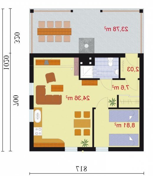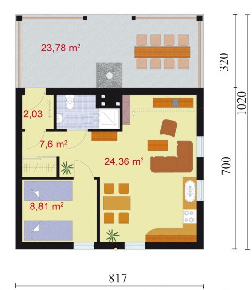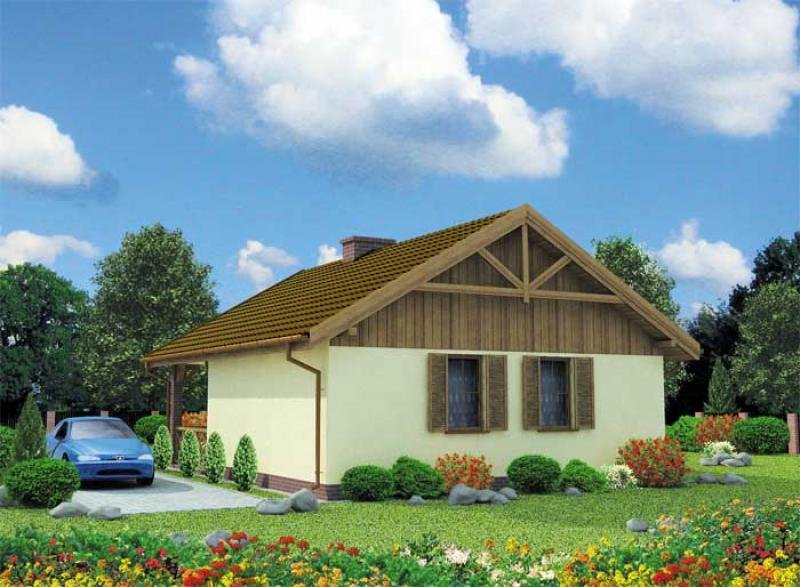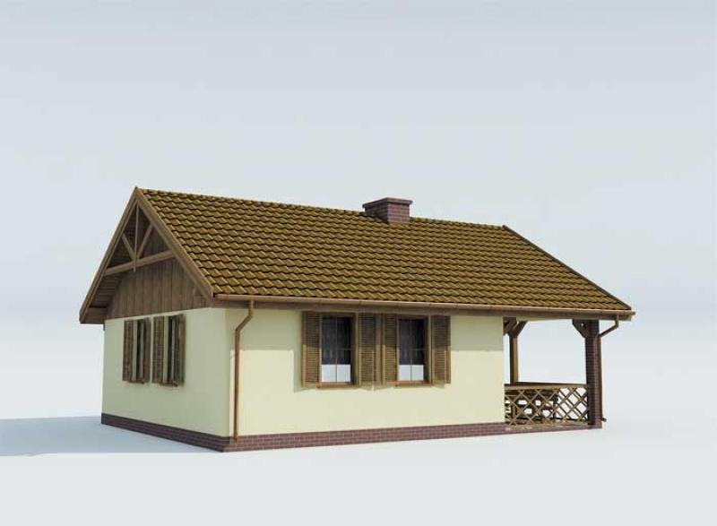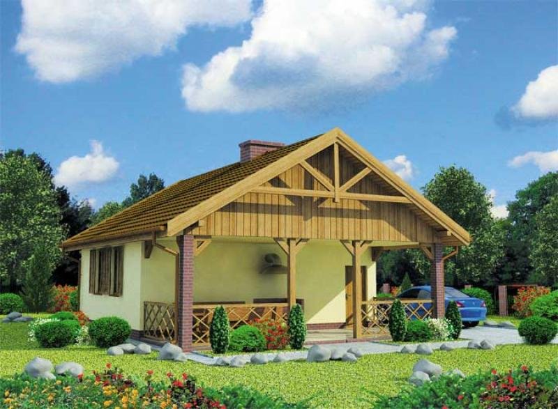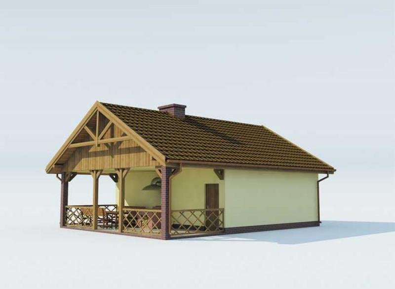 "Palpala" To niewielki domek letniskowy, w którym delikatny dodatek elewacji frontowej stanowi cegła wkomponowana w taras jako zewnętrzne kolumny oraz grill, na którym przyrządzonych zostanie wiele przysmaków. Sielski klimat na zewnątrz budynku wprowadza nas do funkcjonalnego wnętrza, które odsłania całą tajemnicę tego jak powinny zostać zagospodarowane pomieszczenia o małej powierzchni, aby odczuwać komfort płynący z otwartej przestrzeni. Rozwiązanie to zostało zastosowane w pokoju dziennym, w skład którego wchodzą salon, kuchnia i jadalnia. Połączone razem zapewnią stały kontakt między wczasowiczami! Oprócz tego efektownego pomieszczenia w domku znajdziemy również garderobę, łazienkę oraz sypialnię.