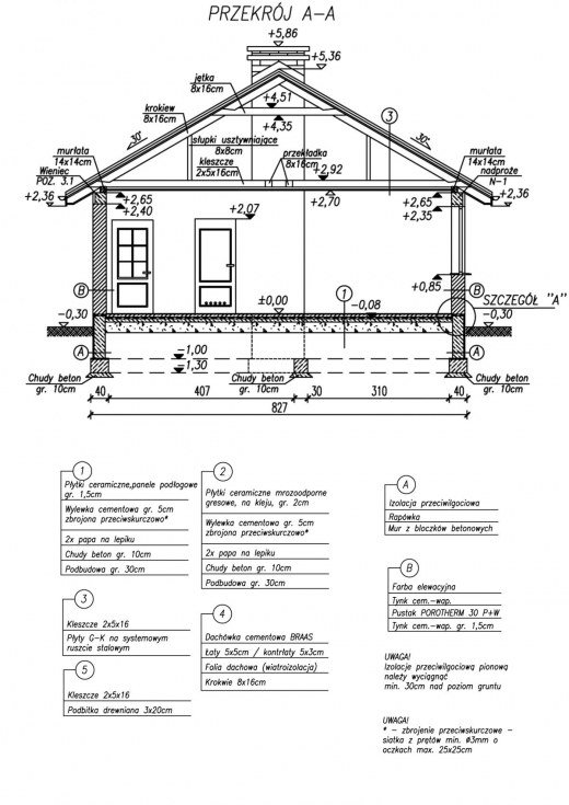 Technologia tradycyjna , ściany zewnętrzne murowane grubości 30 cm, działowe gr. 12 cm. Wszystkieściany wykonane z pustaków ceramicznych "POROTHERM". Konstrukcja więźby dachowej drewniana, pokrycie dachówka ceramiczna. Istnieje mozliwośc adaptacji obiektu na budynek całoroczny - docieplenie warstwą styropianu gr. 10 cm.