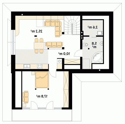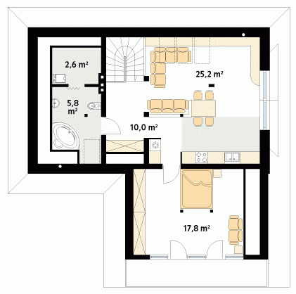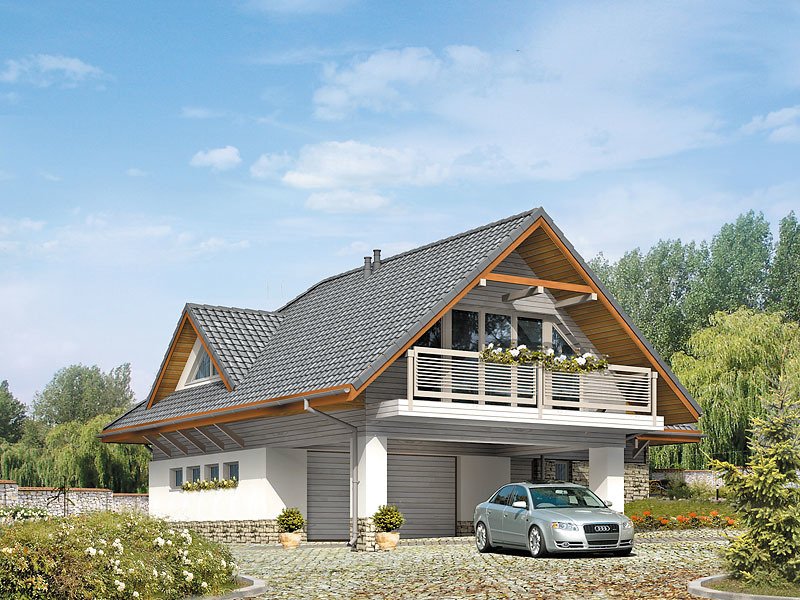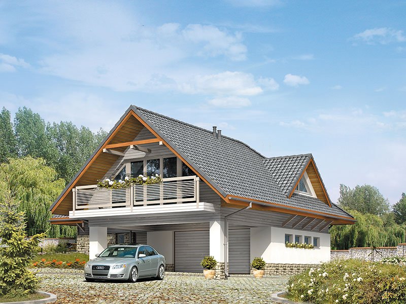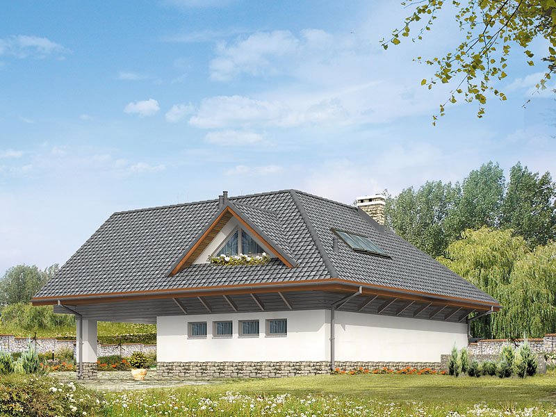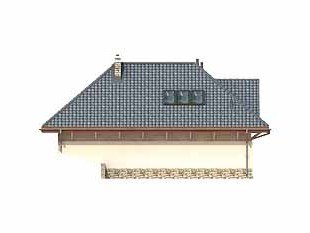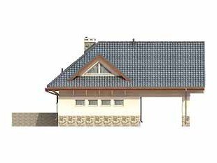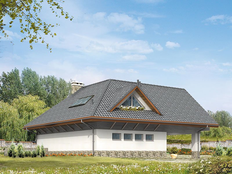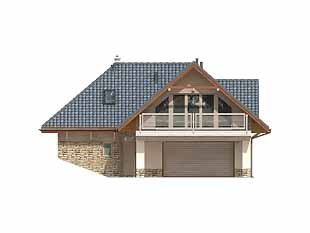 Dom letniskowy, parterowy z poddaszem użytkowym. Przestronny garaż daje możliwość parkowania dwóch samochodów lub samochodu i łodzi. Duże przeszklenie ściany sypialni prowadzące na zadaszony balkon zapewnią komfortowy wypoczynek w niepogodę. Kształt bryły budynku, użycie naturalnych materiałów i dobór detalu architektonicznego pozwolą na wkomponowanie domu w każdy krajobraz.