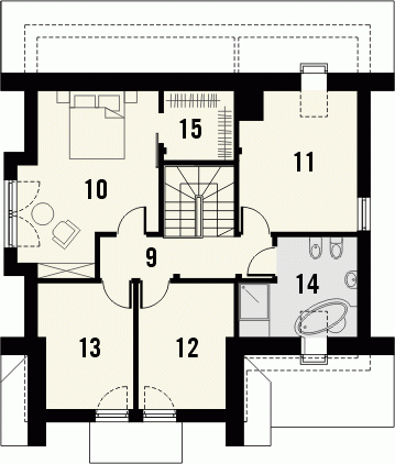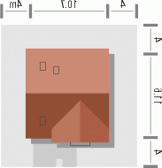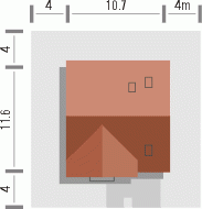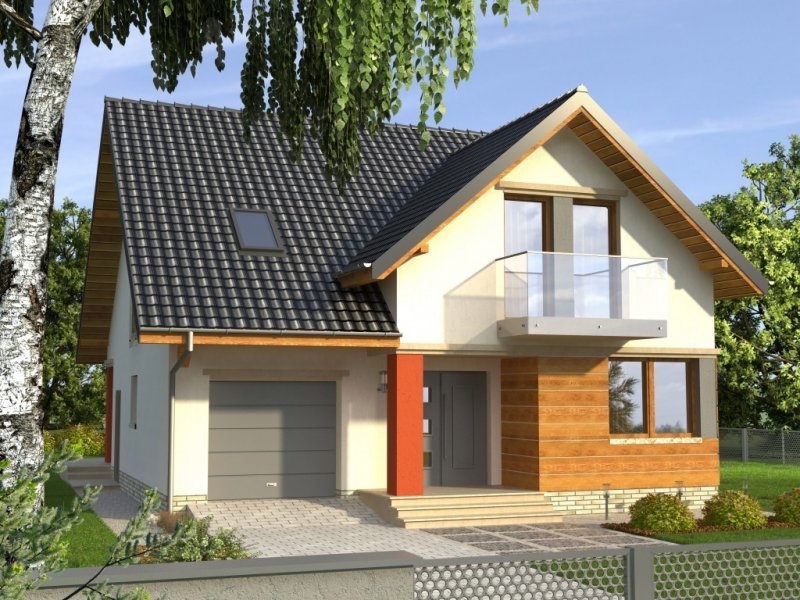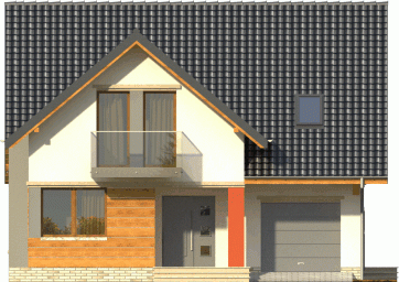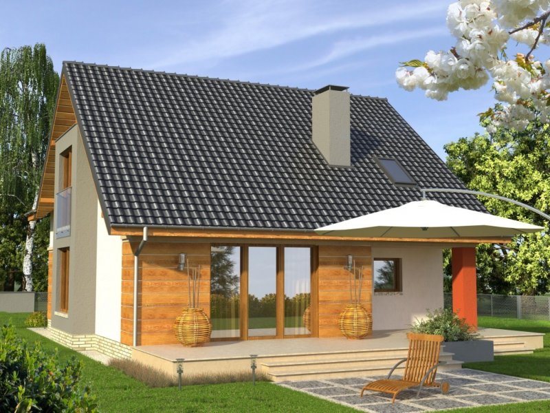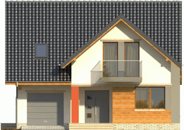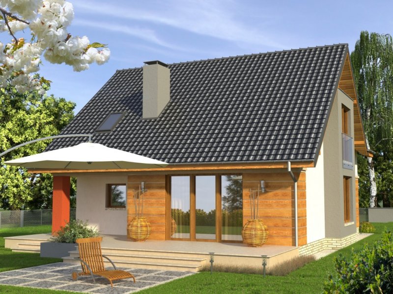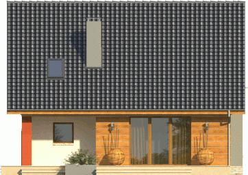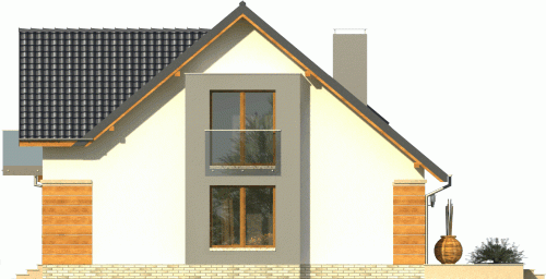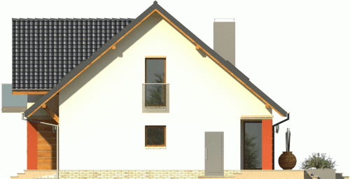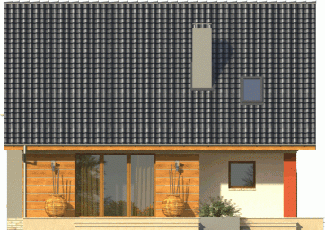 Prosty i tani, średniej wielkości dom z dachem dwuspadowym. Wejście wyeksponowane pod nadwieszeniem stropu wspartym na przyciągającym wzrok słupie. Ozdobą jest też drewniana okładzina na części ścian parteru i żywa kolorystyka fasad.