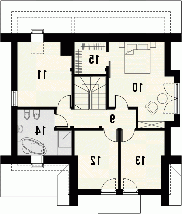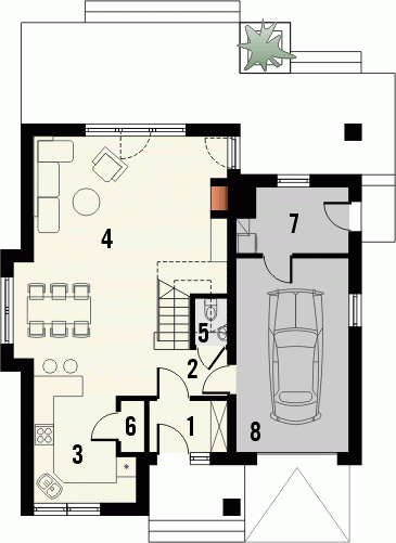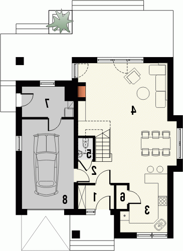 Budynek niepodpiwniczony, piętrowy z garażem jednostanowiskowym. Parter to jednoprzestrzenne wnętrze z salonem, kuchnią i jadalnią. Obok garażu znajduje się wc i duże pomieszczenie gospodarcze, w którym zmieści się kocioł na gaz albo paliwo stałe. Poddasze pod dachem stromym to aż 4 sypialnie, łazienka oraz garderoba. Dokumentacja dostępna również w odbiciu lustrzanym.