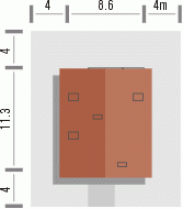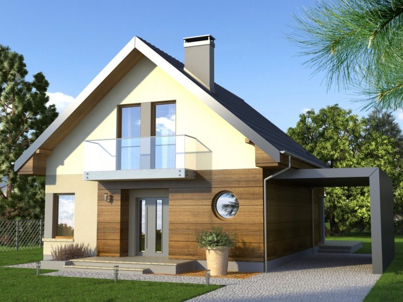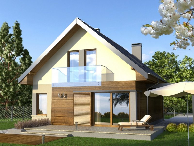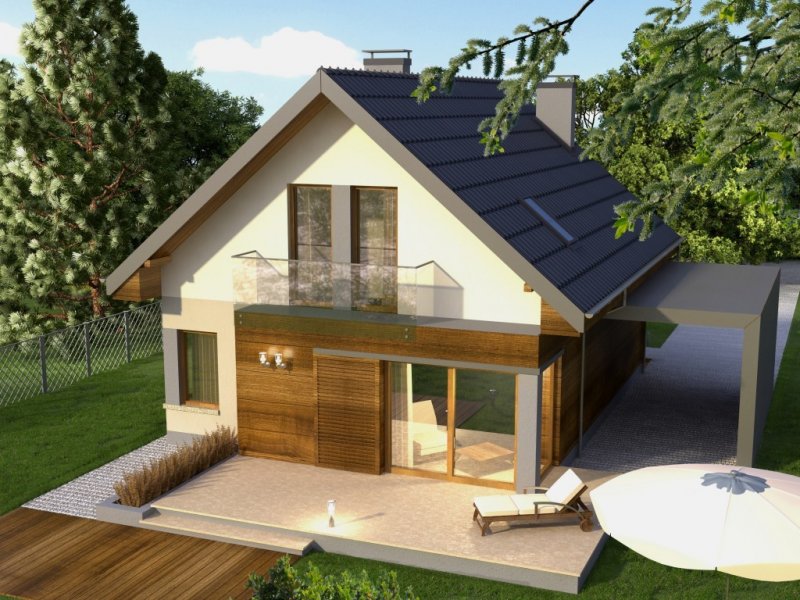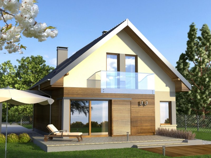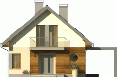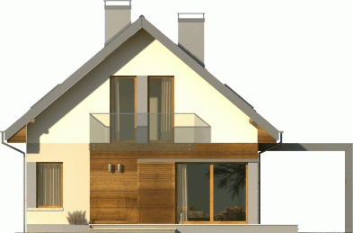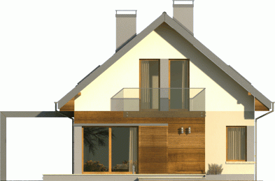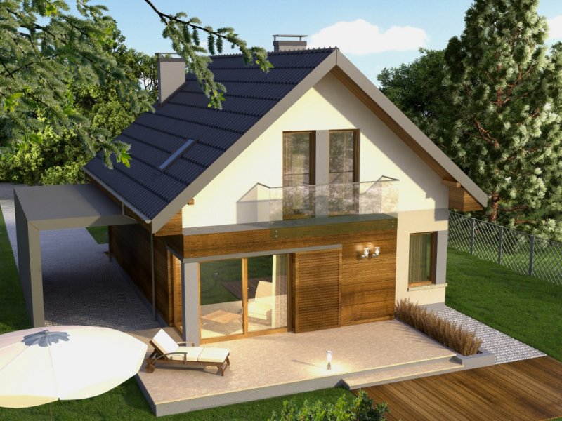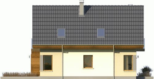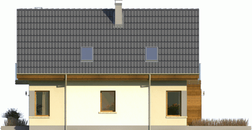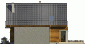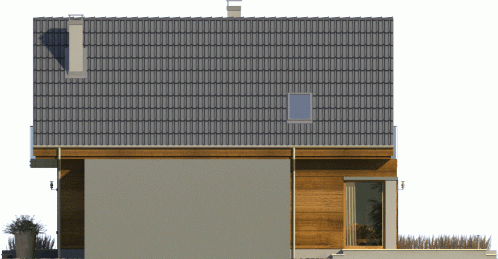 Dom z dachem dwuspadowym ustawiony szczytem od frontu. Zaletą jest jego prosta konstrukcja i elegancki wygląd zewnętrzny dzięki zastosowaniu deskowania na fragmentach ścian oraz nowoczesnych detali szklanych balustrad i obróbek.