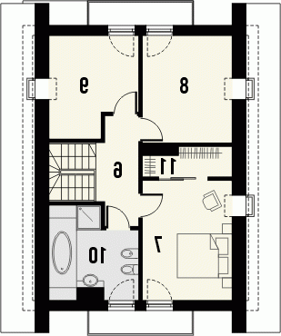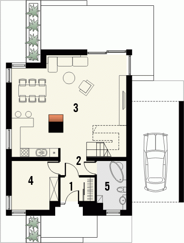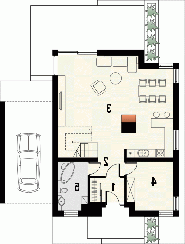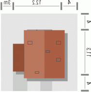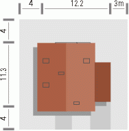 Budynek niepodpiwniczony, piętrowy, wariantowo z wiatą na samochód lub bez. Klasycznie rozplanowany parter to jednoprzestrzenny salon z kuchnią, dodatkowy pokój i łazienka. Na poddaszu znalazły się trzy sypialnie, łazienka i garderoba. Dokumentacja dostępna również w odbiciu lustrzanym.