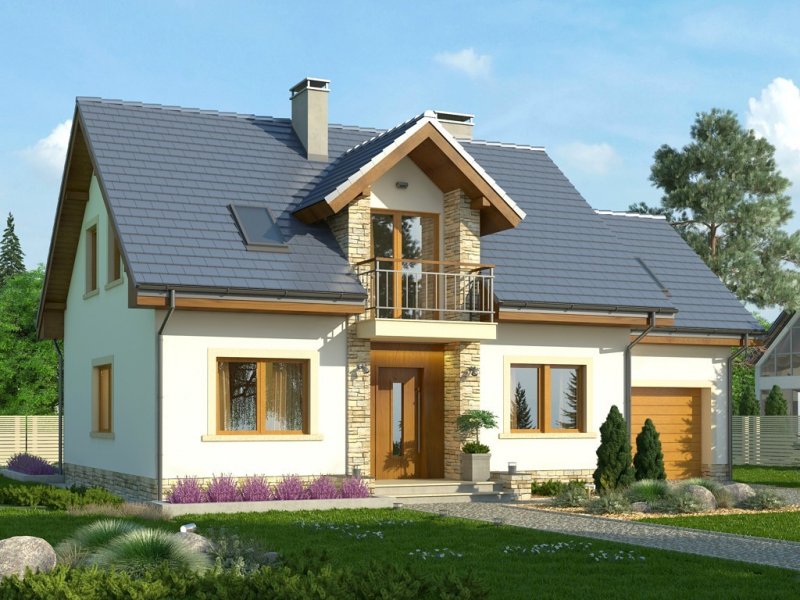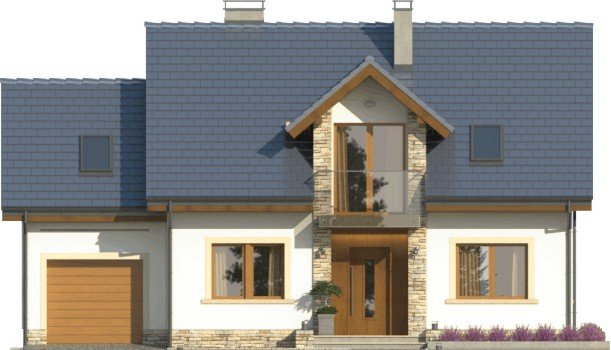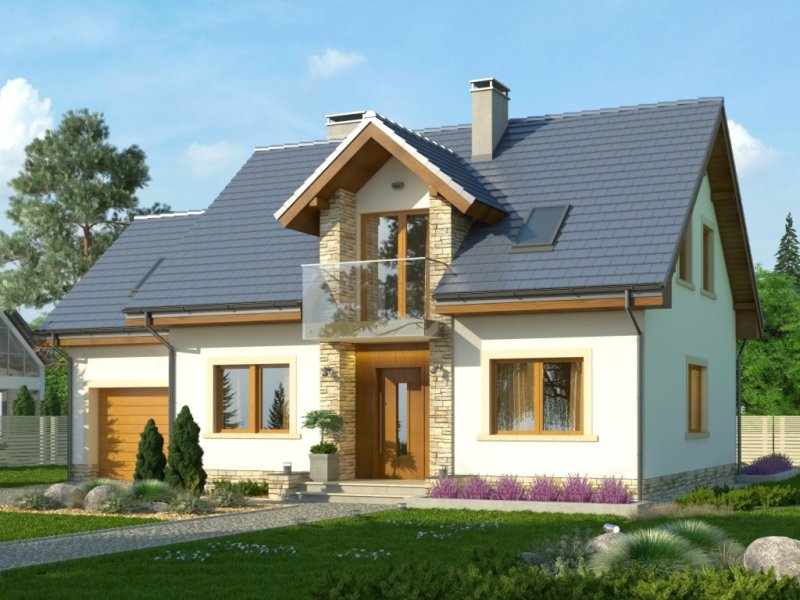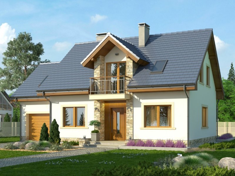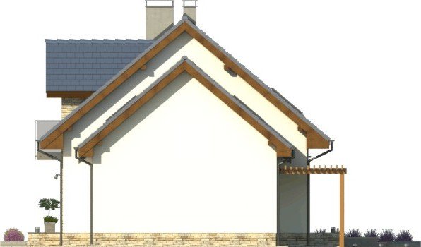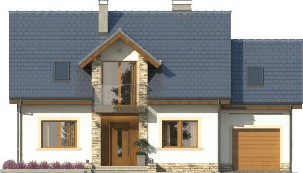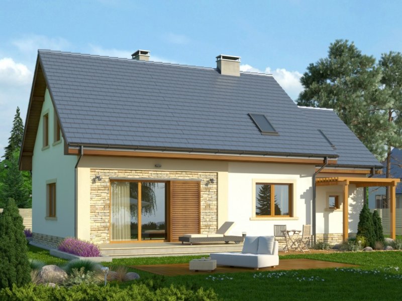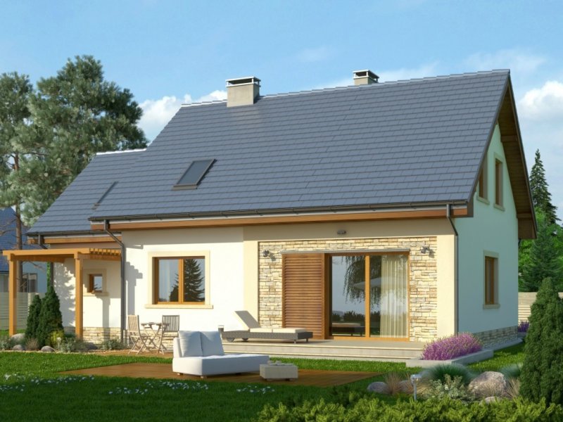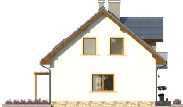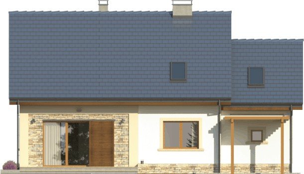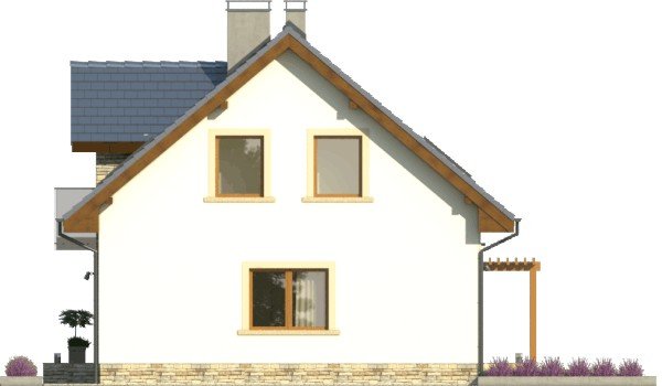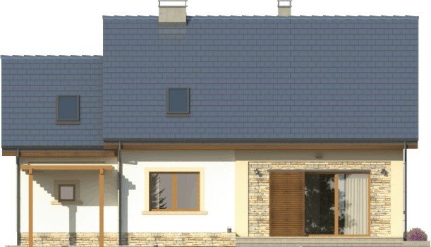 Funkcjonalny dom z dachem dwuspadowym. Wejście główne oraz wyjście na taras podkreślone płytkami kamiennymi.
