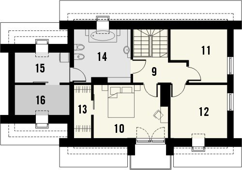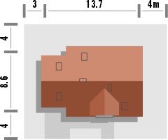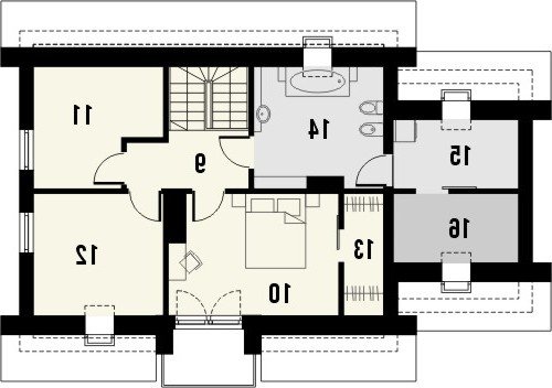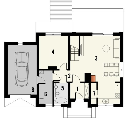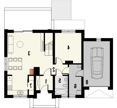 Budynek niepodpiwniczony, piętrowy z garażem jednostanowiskowym. Na parterze obok salonu połączonego z kuchnią zaprojektowano dodatkowy pokój, łazienkę i pomieszczenie gospodarcze. Od strony kuchni dostępna jest spiżarnia. Na poddaszu znajdują się 3 sypialnie, wygodna łazienka, garderoba, pralnia i strych. Dokumentacja dostępna również w odbiciu lustrzanym.