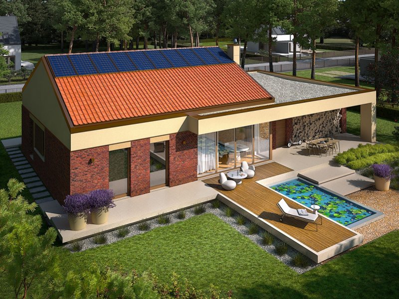 - Dach o konstrukcji drewnianej pokryto dachówką ceramiczną Röben, nad garażem zastosowano stropodach odwrócony