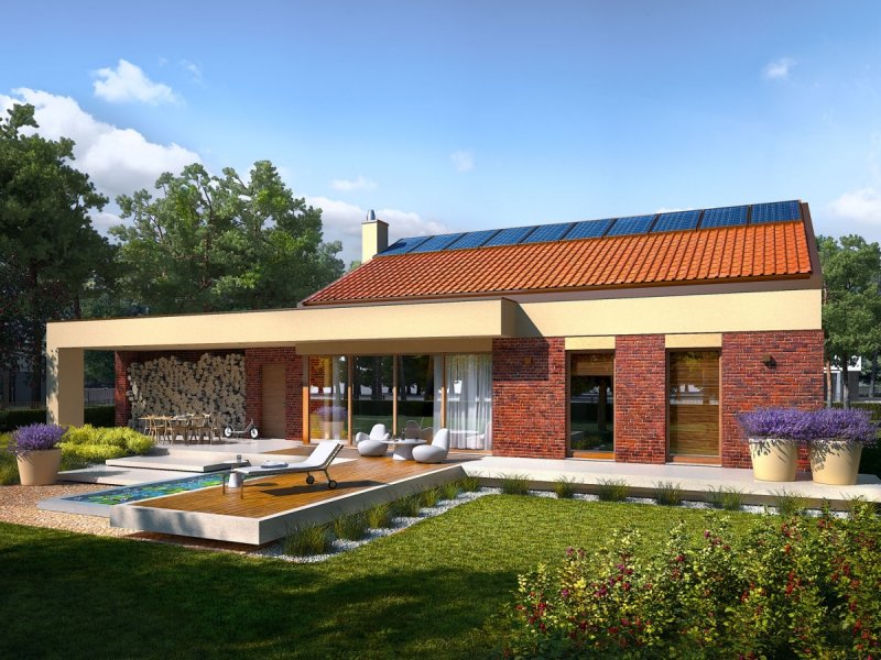 Ex 11 G2 (wersja B) soft to dom, który od pierwszego wejrzenia intryguje swoim atrakcyjnym wyglądem zewnętrznym. Kompozycja elewacji łączy urodę waniliowego tynku z ponadczasowym wdziękiem klinkieru, który pięknie koresponduje z kolorem dachówki. Planując rozkład pomieszczeń, uwzględniono strefowanie temperaturowe, dzięki czemu optymalnie zaprojektowano funkcje. W trosce o codzienny komfort użytkowy, w myśl zasady – ergonomia w parze z wygodą, wyodrębniono część dzienną, nocną i gospodarczą. Podział domowych stref, pomysłowo zaakcentowano różnorodnym zadaszeniem – nad częścią mieszkalną zastosowano dach dwuspadowy, nad częścią gospodarczą – stropodach odwrócony. Uzupełnieniem układu funkcjonalnego są przestronne tarasy, które zaplanowano od frontu i ogrodu – od wiosny do późnej jesieni stanowią one dodatkową strefę rekreacyjną, zachęcając domowników do relaksu w towarzystwie balsamicznej zieleni ogrodu. W trosce o codzienny komfort mieszkańców zadbano nawet o praktyczny składzik na drewno.