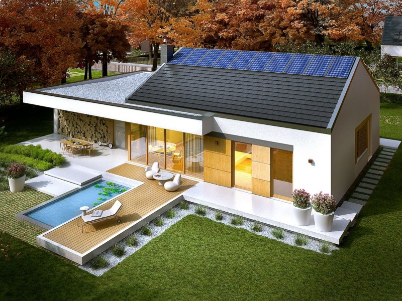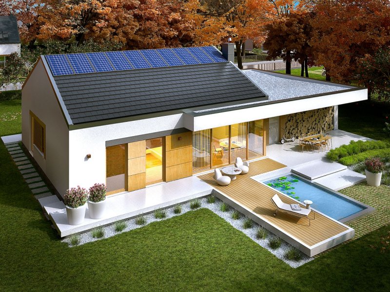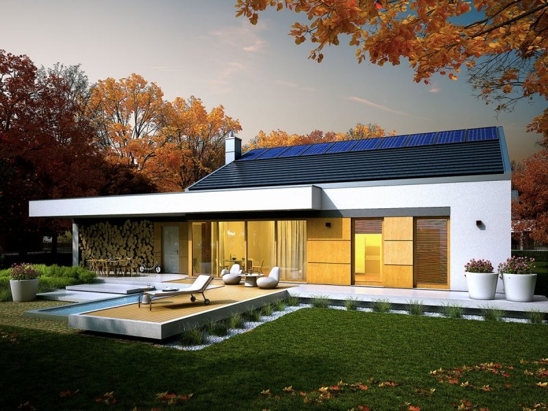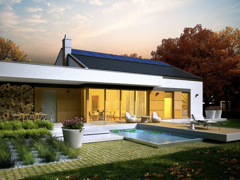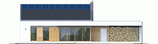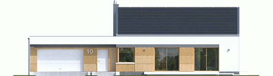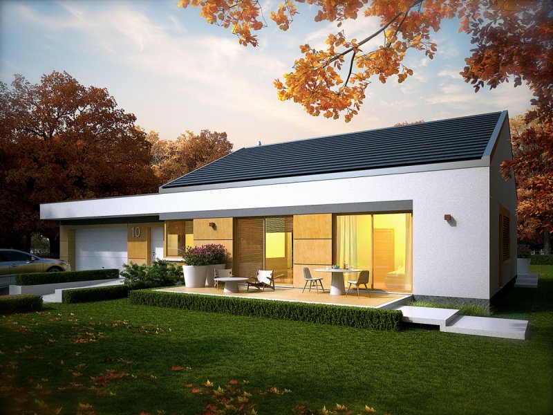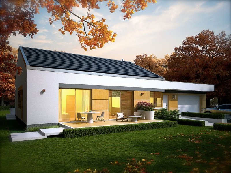 Ex 11 G2 (wersja C) soft to harmonia czystych połączeń i nowoczesna elegancja w najmodniejszym wydaniu. Uwagę zwraca ciekawie zaprojektowane zadaszenie – nad częścią mieszkalną zastosowano dach dwuspadowy, nad częścią gospodarczą – stropodach odwrócony. Dzięki takiemu zabiegowi udało się pomysłowo zaznaczyć podział domowych funkcji, a cała bryła zyskała oryginalny, wyrazisty charakter. Największym atutem projektu są imponujące przeszklenia, dzięki którym granica między wnętrzem a ogrodem subtelnie się zaciera, a wnętrza zyskują słoneczny charakter.