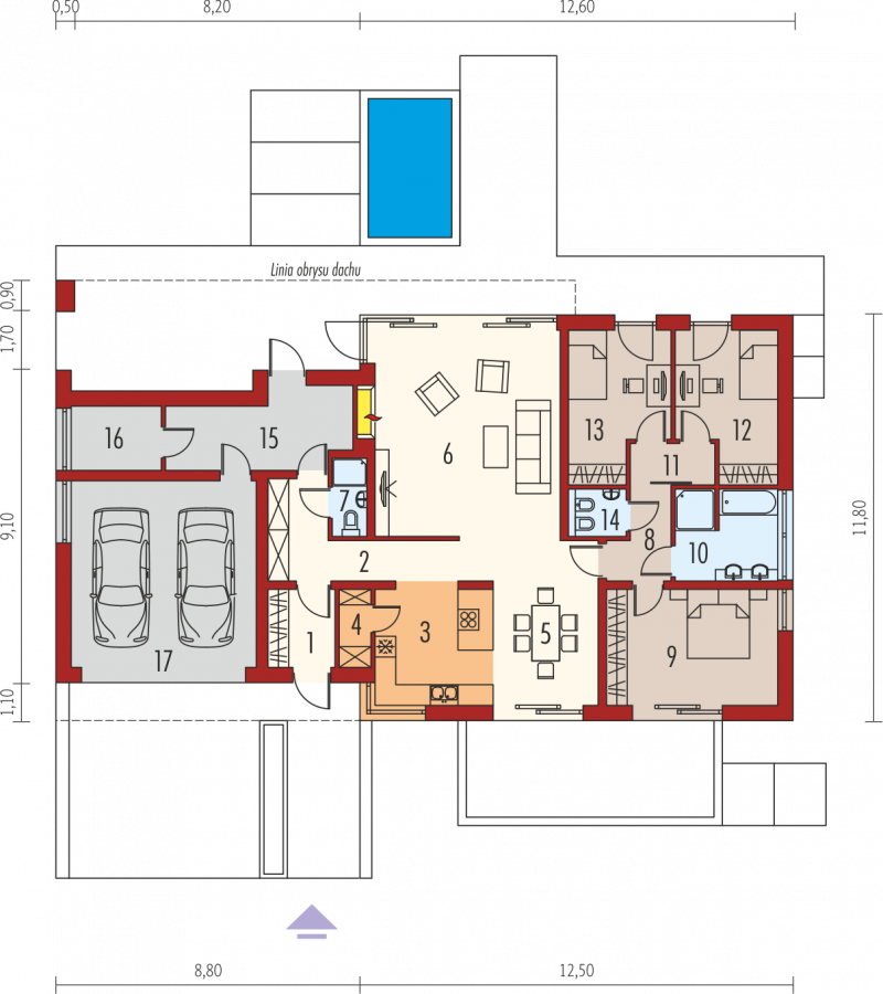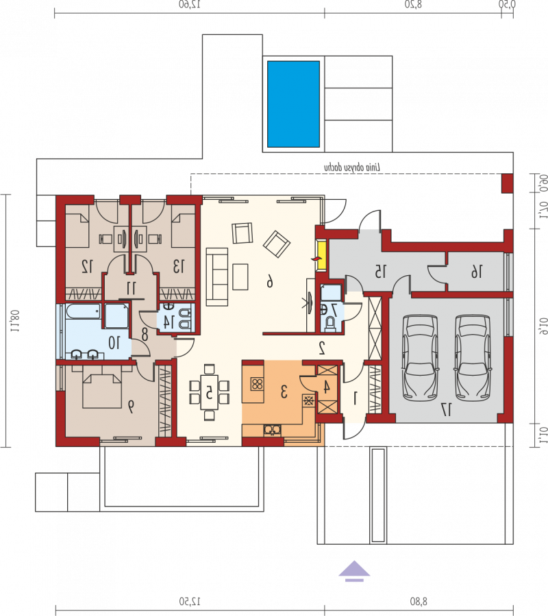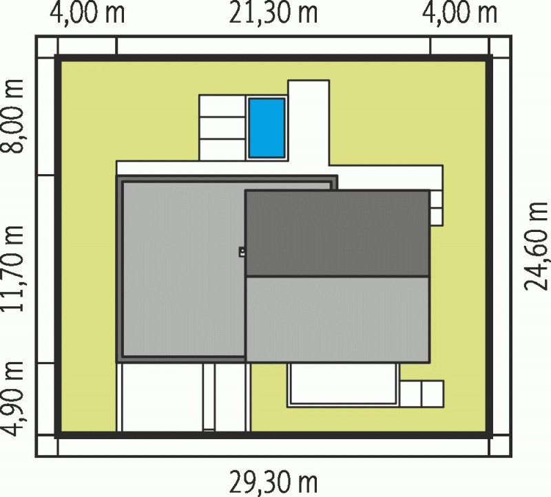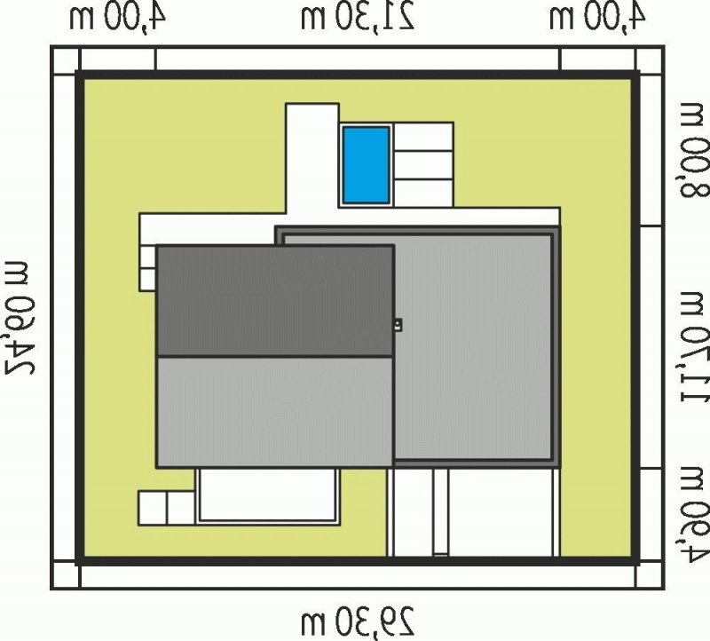- Dach o konstrukcji drewnianej pokryto dachówką płaską lub inną o podobnych parametrach, nad garażem zastosowano stropodach odwrócony