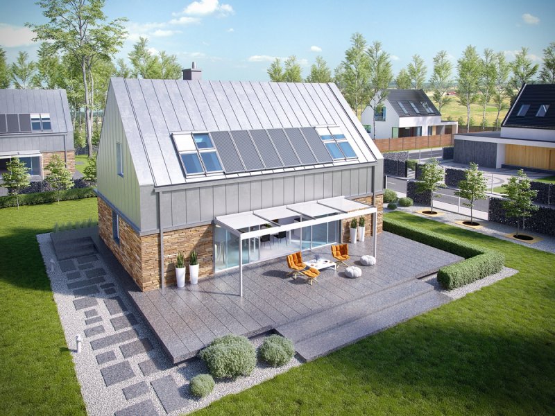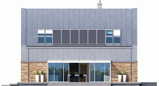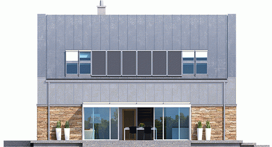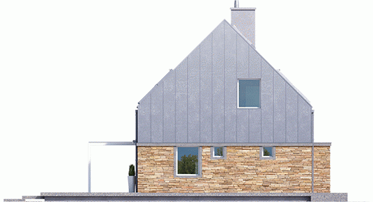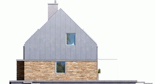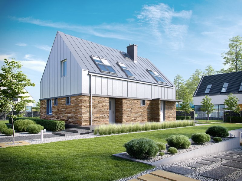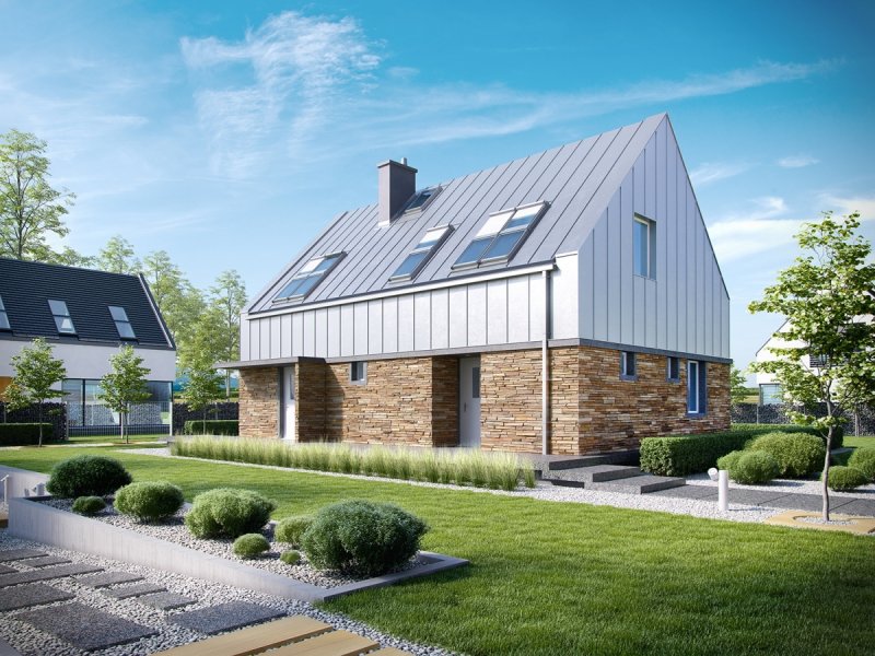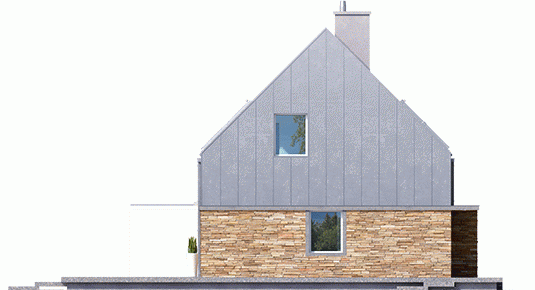 Elewacja: tynk cienkowarstwowy mineralny, okładzina kamienna i blaszana