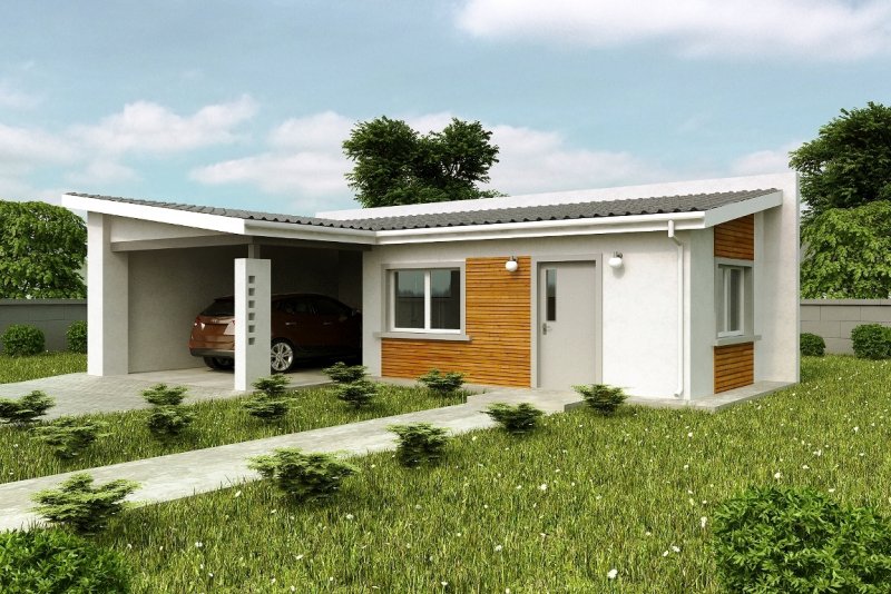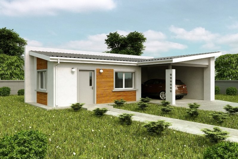 Projekt budynku parterowego, niepodpiwniczonego, z dwoma pomieszczeniami gospodarczymi i wiatą. Do projektu dołączone jest zestawienie: stali, więźby dachowej oraz stolarki drzwiowej i okiennej, jak równieżbezpłatna zgoda na dokonanie zmian.
