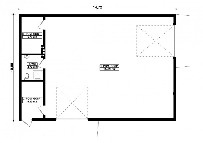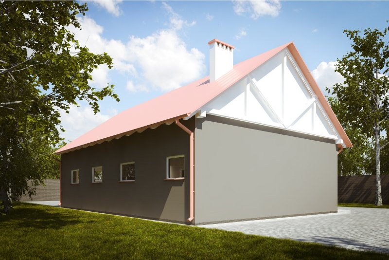 Projekt budynku parterowego, niepodpiwniczonego z trzema pomieszczeniami gospodarczymi i WC. Do projektu dołączone jest zestawienie: stali, więźby dachowej oraz stolarki drzwiowej i okiennej, jak równieżbezpłatna zgoda na dokonanie zmian.