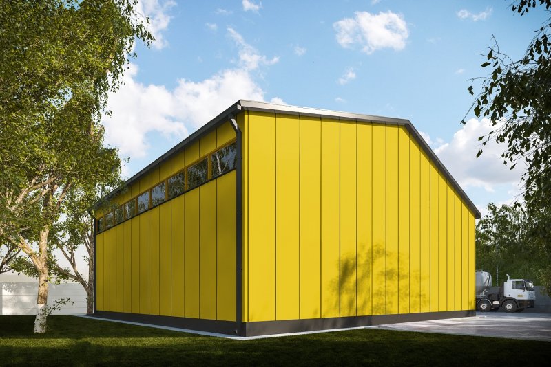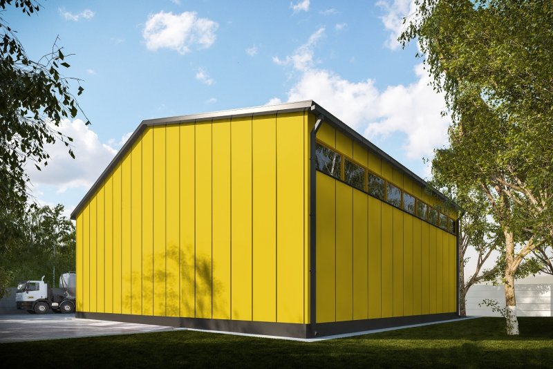 Budynek konstrukcji stalowej. Ściany z płyty warstwowej. Brama o wymiarach 4,00x3,50m. Więźba dachowa dwuspadowa, stalowa, pokryta płytą warstwową.