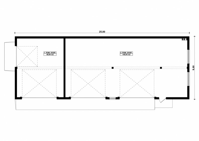 Projekt budynku parterowego, niepodpiwniczonego, z dwoma pomieszczeniami gospodarczymi. Do projektu dołączone jest zestawienie: stali, więźby dachowej oraz stolarki drzwiowej i okiennej, jak równieżbezpłatna zgoda na dokonanie zmian.