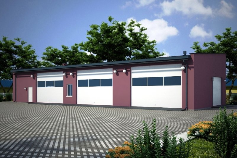 Budynek wykonany w technologii tradycyjnej. Ściany warstwowe grubości 29cm, murowane z z pustaków ceramicznych „MAX” grubości 19cm, ocieplone styropianem grubości 10cm. Ściany wewnętrzne z pustaków ceramicznych „MAX” grubości 25cm .Bramy o wymiarach 3,00x3,00m 5,00x4,00m. Komin z cegły ceramicznej pełnej. Słupy i podciągi żelbetowe. Więźba dachowa jednospadowa, drewniana, pokryta blachą trapezową.