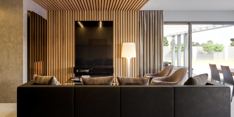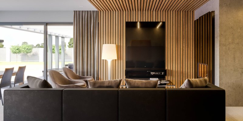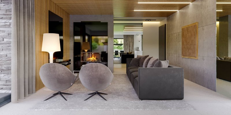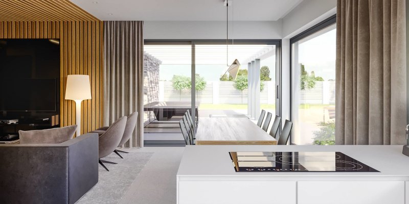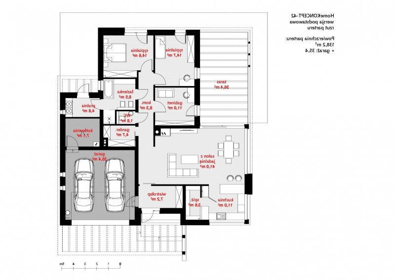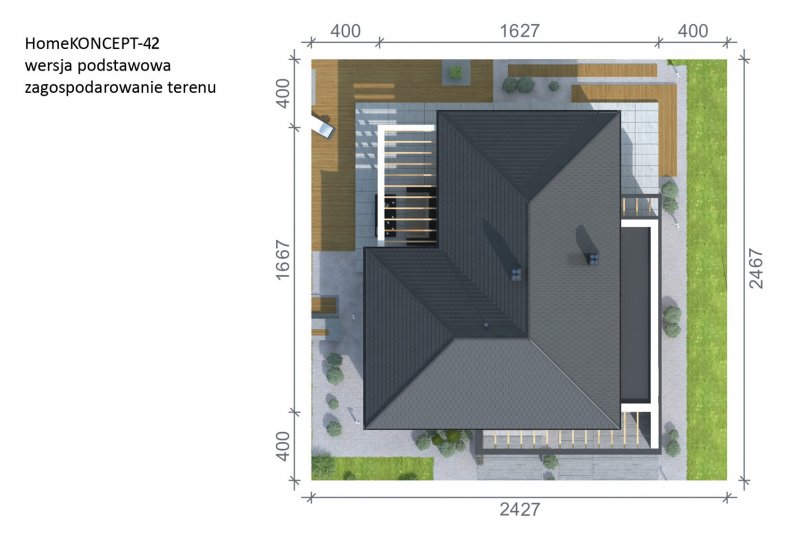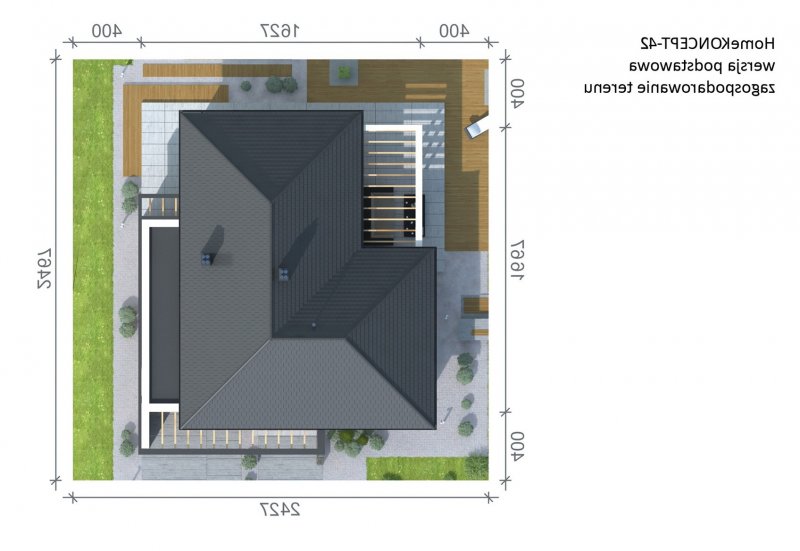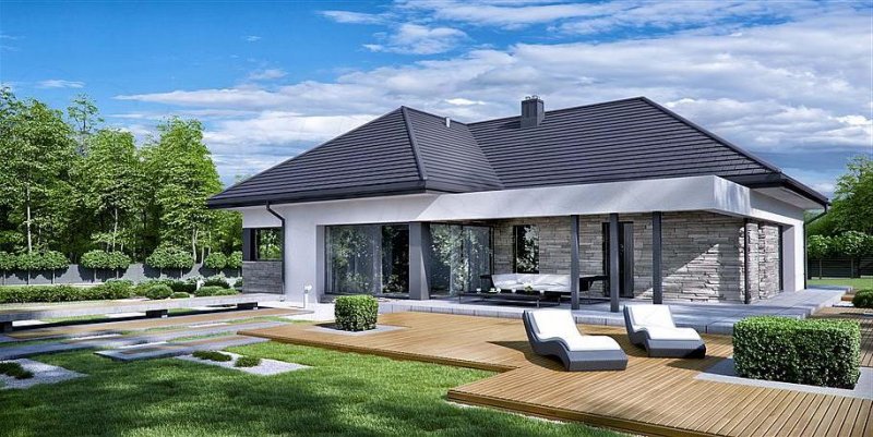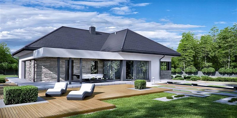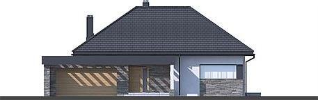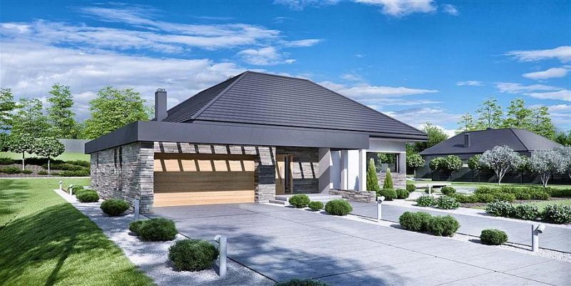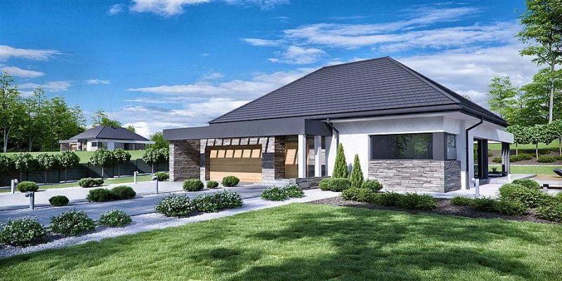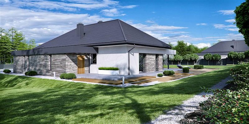 HomeKONCEPT 42 to projekt domu parterowego z garażem 2-stanowiskowym, który doskonale wpisuje się w płytkie działki o głębokości 24,7 m. Bryła budynku w kształcie litery L została ozdobiona charakterystycznym belkowaniem, eksponującym strefę wejściową domu oraz okalającym przestronny taras, znajdujący się od strony ogrodu. Elewacja skomponowana z naturalnego kamienia i tynku podkreśla nowoczesną stylistykę domu. Płaska dachówka w kolorze antracytowym stanowi eleganckie dopełnienie całości. Duże przeszklenia zastosowane w projekcie doskonale doświetlają wnętrza domu.