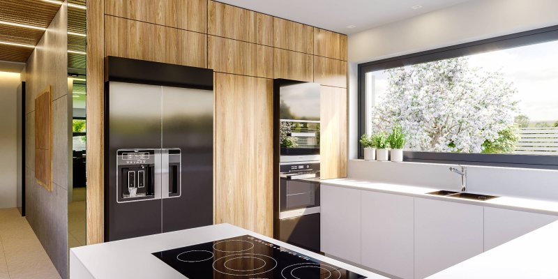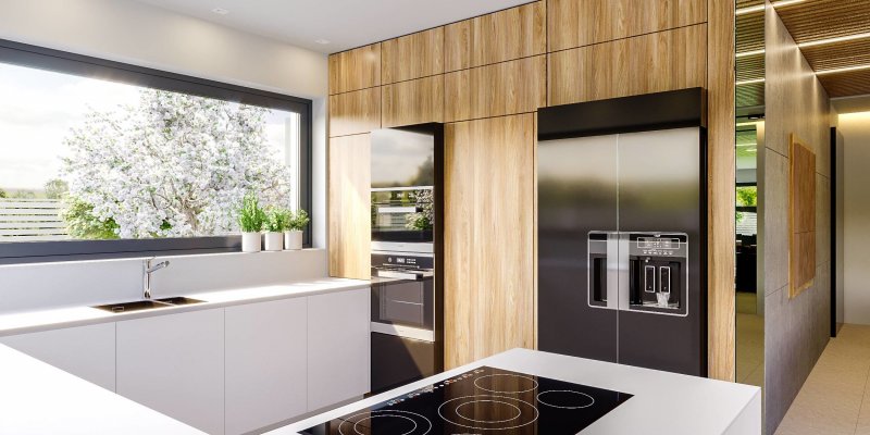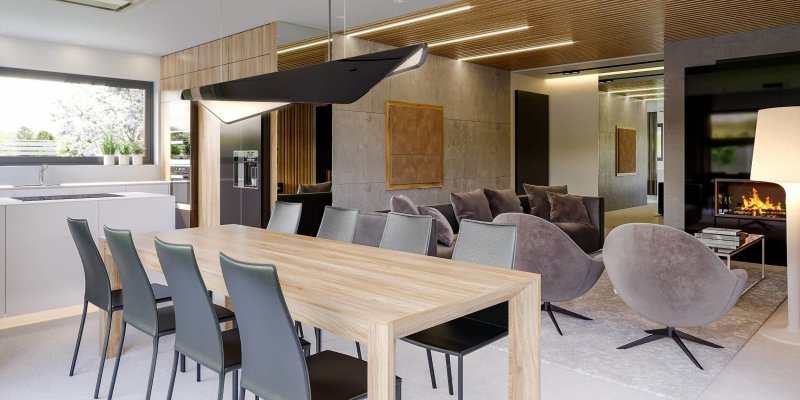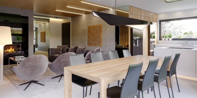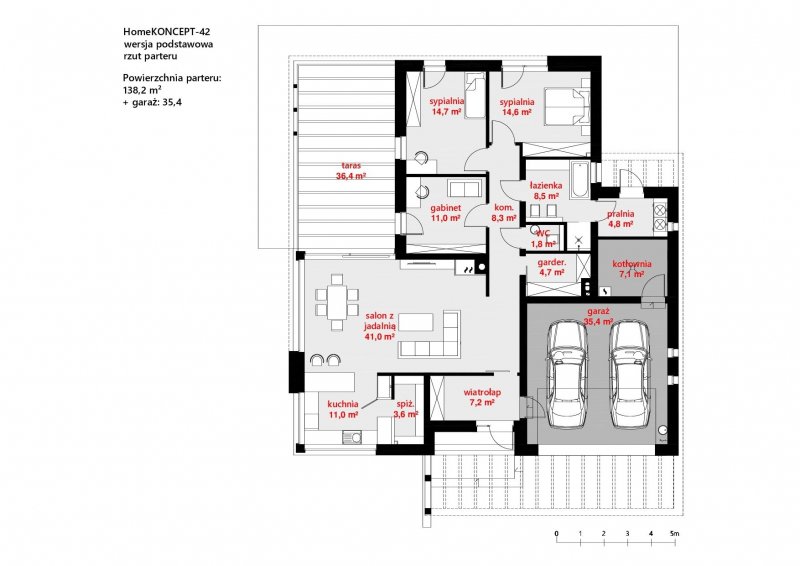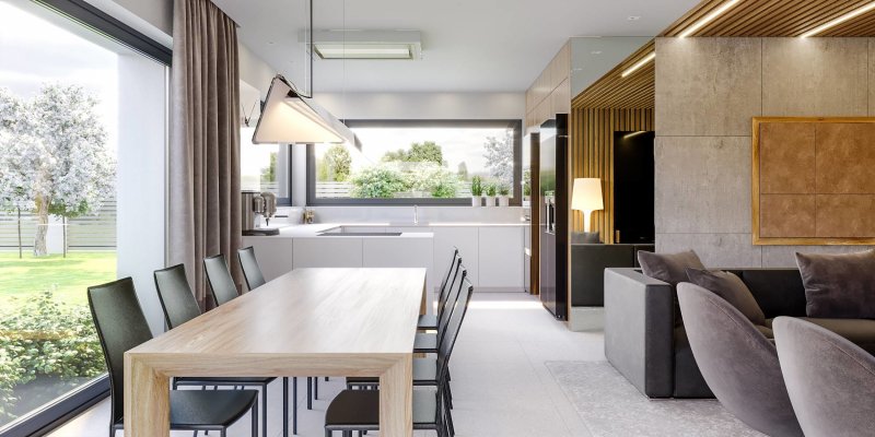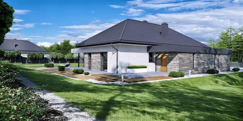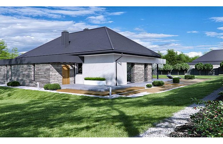 Projekt należy do kolekcji domów parterowych i jest zaprojektowany w standardzie energooszczędnym z wentylacją mechaniczną.