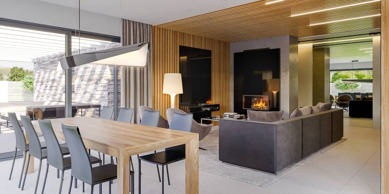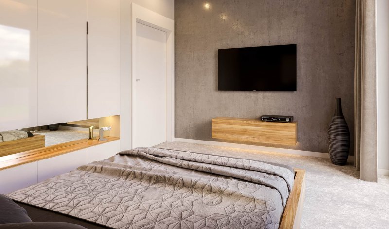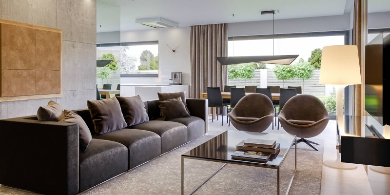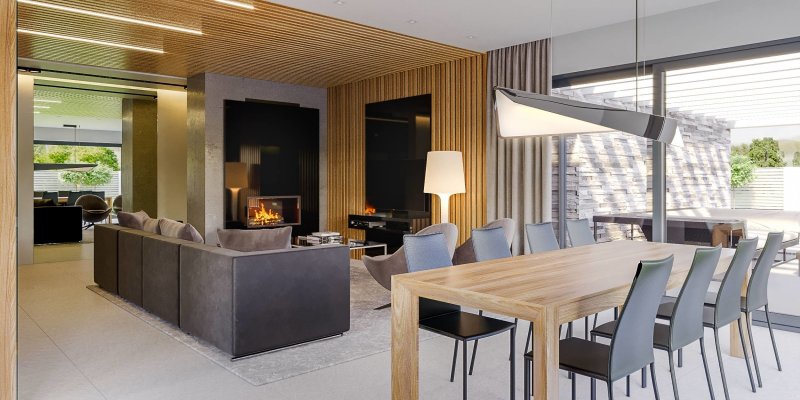 W układzie funkcjonalnym zwraca uwagę wyraźny podział na strefę dzienną i nocną. Duży, ustawny salon tworzy razem z jadalnią i kuchnią atrakcyjną, otwartą przestrzeń, w której każdy domownik znajdzie miejsce dla siebie. W salonie został zaprojektowany kominek, który w czasie chłodniejszych dni można wykorzystać do dogrzewania pomieszczeń. W strefie nocnej znajdują się 3 pokoje, każdy w wyjściem na taras. Duża rodzinna łazienka została połączona z pomieszczeniem pralni, a do dyspozycji mieszkańców w strefie nocnej jest jeszcze osobna toaleta i przestronna garderoba. Program funkcjonalny domu uzupełniają praktyczna spiżarnia przy kuchni oraz duża kotłownia za garażem 2-stanowiskowym, pełniąca funkcję pomieszczenia gospodarczego.
