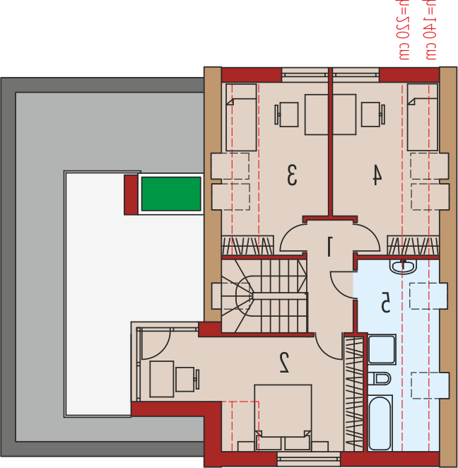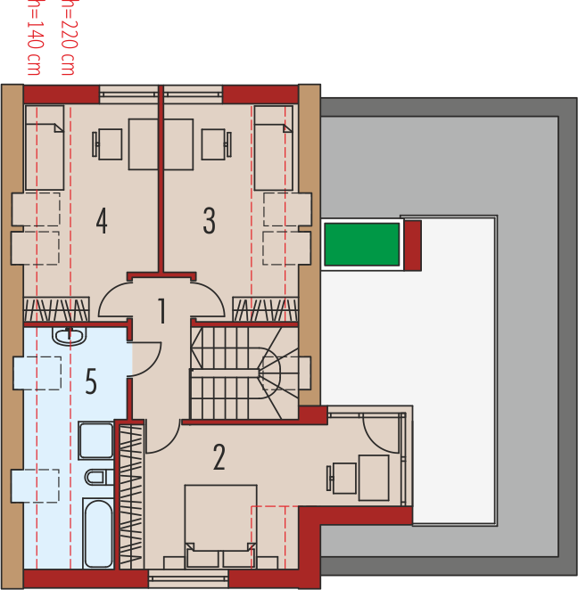 Dach: konstrukcja drewniana, ocieplenie wełna mineralna 30 cm, dachówka płaska lub inna o podobnych parametrach