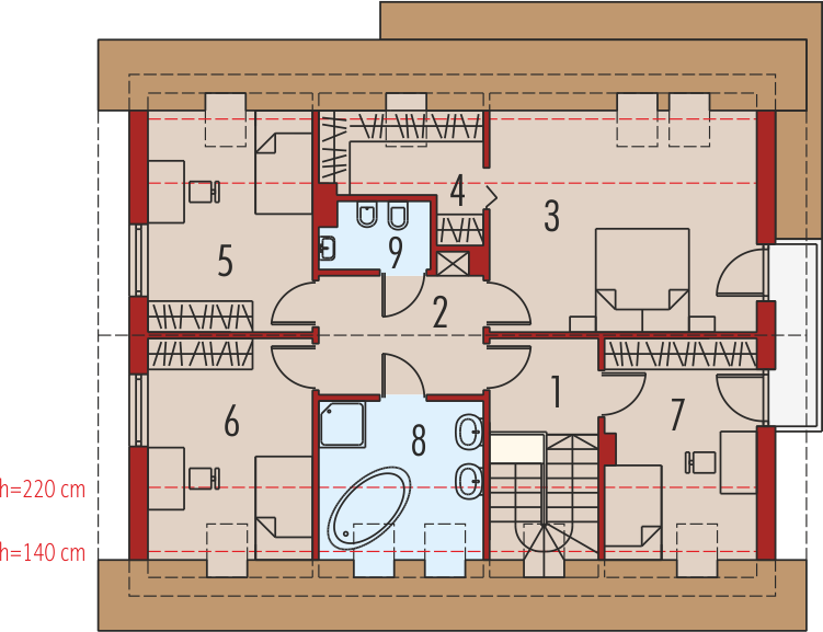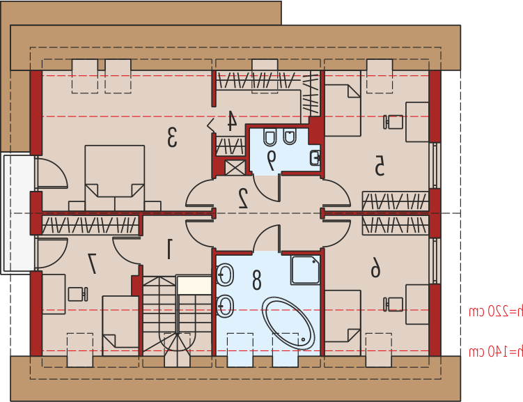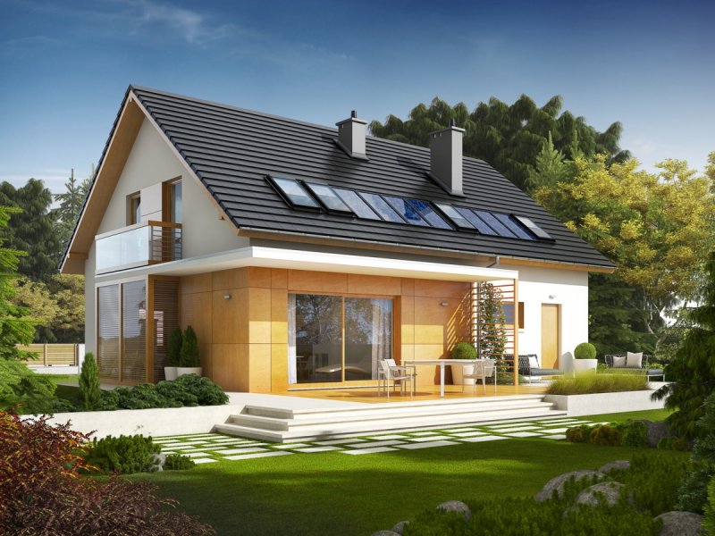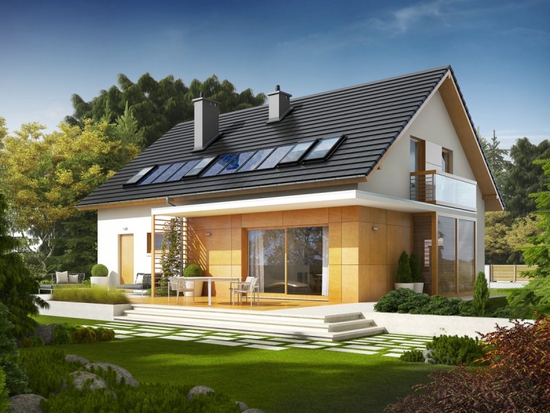 - Dach o konstrukcji drewnianej pokryty dachówką płaską lub inną o podobnych parametrach