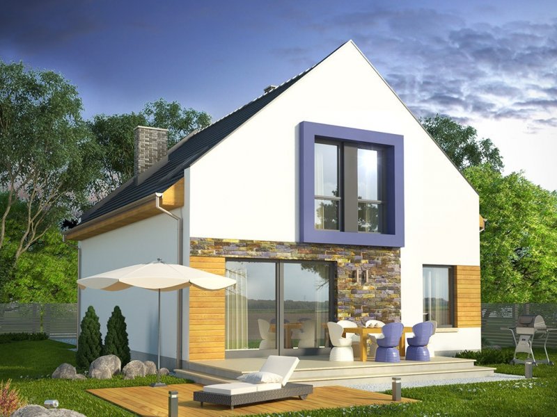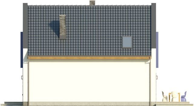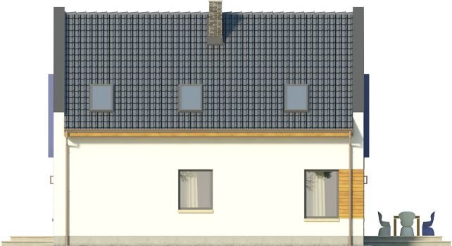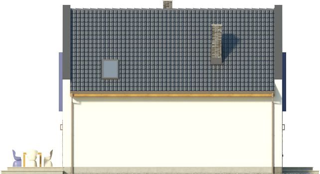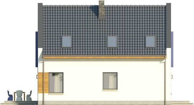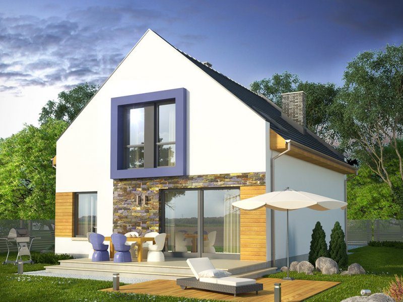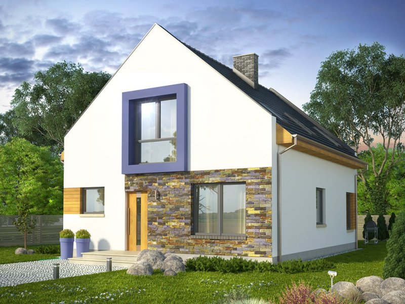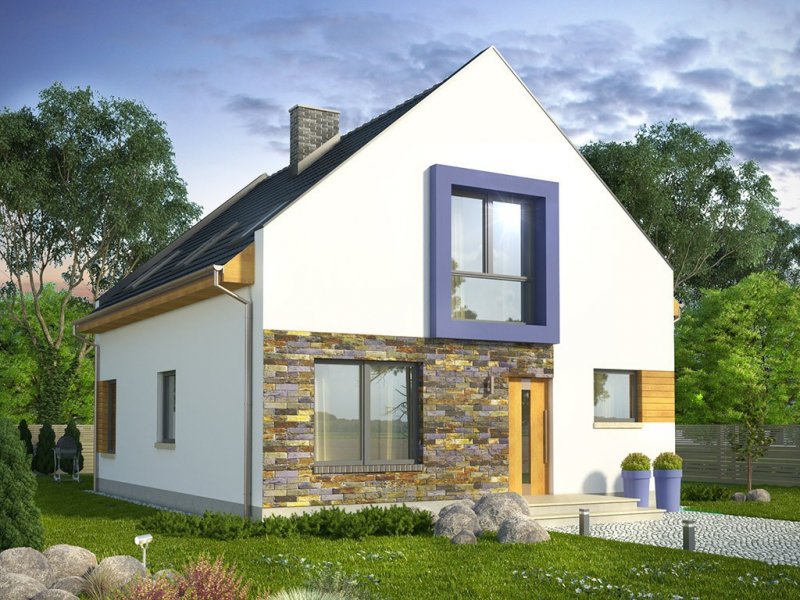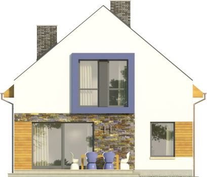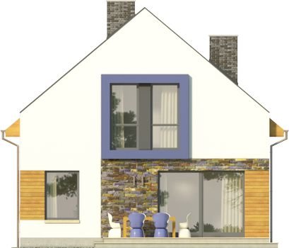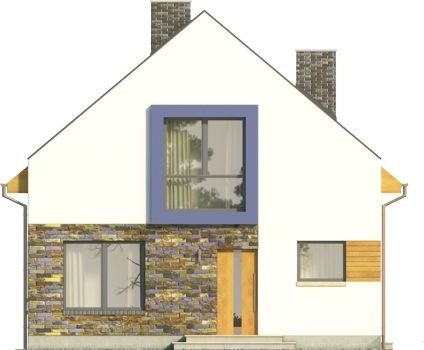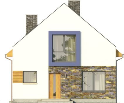 Ściany szczytowe wyprowadzone są nieco powyżej jego górnej krawędzi, dzięki czemu to one najbardziej przykuwają uwagę. Wokół okien na piętrze zaprojektowano ponadto mocne obramienie, podkreślone dodatkowo lawendowym kolorem. Inne materiały elewacyjne to drewno i płytka kamienna. Dostępna także lustrzana wersja projektu (oraz z garażem, a także w zbliźniaczeniu).Materiały, z których wykonano budynek, to gazobeton + styropian (ściany), tynk + okładzina kamienna + okładzina z drewna (wykończenie ścian), strop TERIVA , drewno (więźba), dachówka ceramiczna (pokrycie dachu). Na etapie adaptacji dostępne są inne materiały.