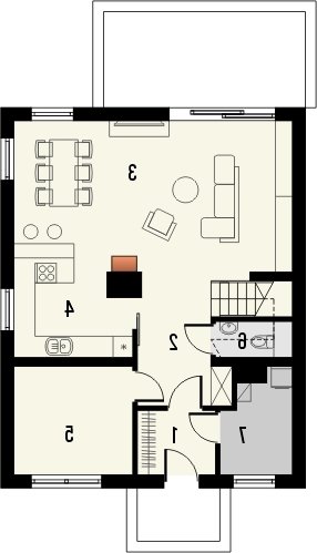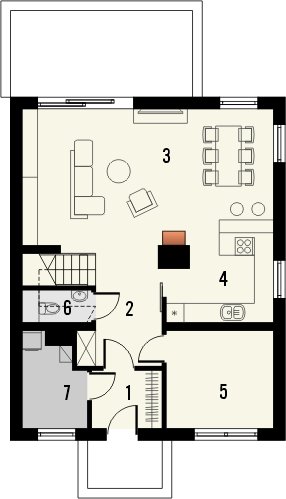 PIONIER 2 to prosty, nowoczesny, średniej wielkości dom jednorodzinny bez garażu. Salon z jadalnią i otwartą kuchnią zajmują większą część parteru, ale nie zabrakło również miejsca na dodatkowy pokój, pomieszczenie gospodarcze oraz wc. Na piętrze z holu dostępne są łazienka i 3 pokoje. Jeden z nich posiada wydzieloną garderobę.Dom posiada prosty, dwuspadowy dach.