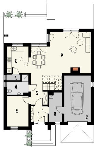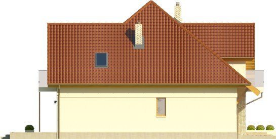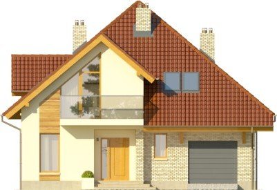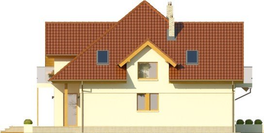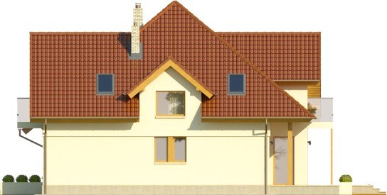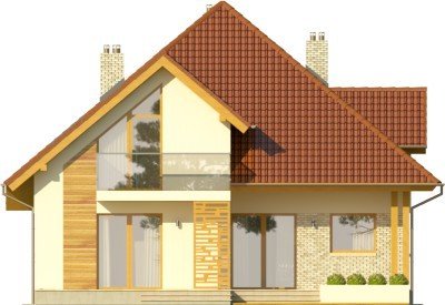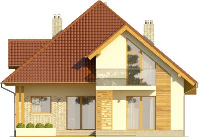 Budynek niepodpiwniczony piętrowyz wbudowanym garażem jednostanowiskowym. Na parterze obok salonu zkominkiem, kuchni ze spiżarnią i jadalni zaprojektowano takżedodatkowy pokój w części frontowej domu. Przejście do garażuprowadzi przez pomieszczenie gospodarcze. Na piętrze pod dachemkopertowym znalazły się 3 sypialnie, garderoba oraz łazienka zwydzieloną pralnią. Dwie sypialnie zaprojektowano z wyjściem nabalkon, jedna posiada wydzieloną garderobę. Dokumentacja dostępnarównież w odbiciu lustrzanym. Dom wyróżnia sięreprezentacyjną elewacją frontową z asymetrycznie zaprojektowanymszczytem, co dodatkowo podkreślone zostało oknami,zaprojektowanymi tylko po jednej stronie. Od strony ogrodu uwagęprzykuwa zadaszenie nad tarasem oraz również asymetria elewacji.Duże powierzchnie przeszklone zapewnią dobre doświetlenie salonu.