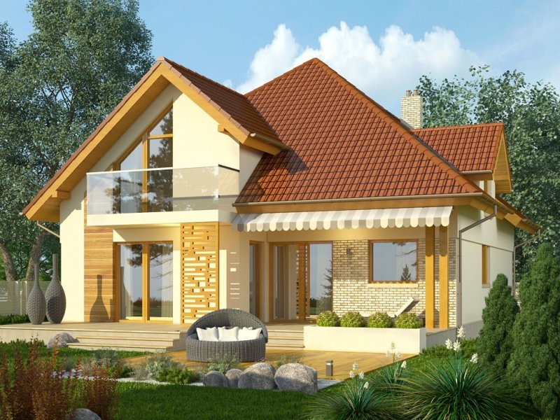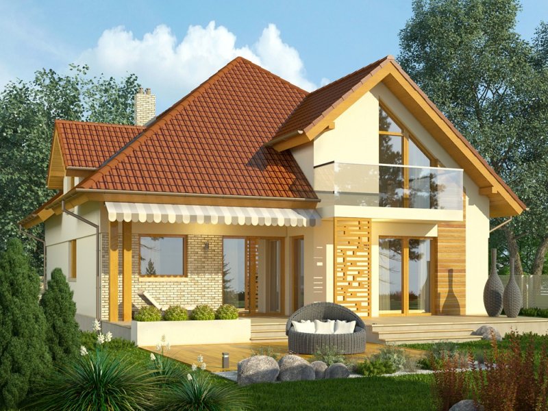 Ściany budynku zaprojektowano z betonu komórkowego zdociepleniem lub w innej technologii w ramach adaptacji. Stropgęstożebrowy, więźba drewniana, pokrycie dachówką ceramicznąlub cementową. Elewacje tynkowane, częściowo okładane płytkamiklinkierowymi oraz okładziną drewnianą .