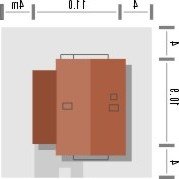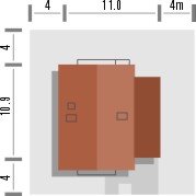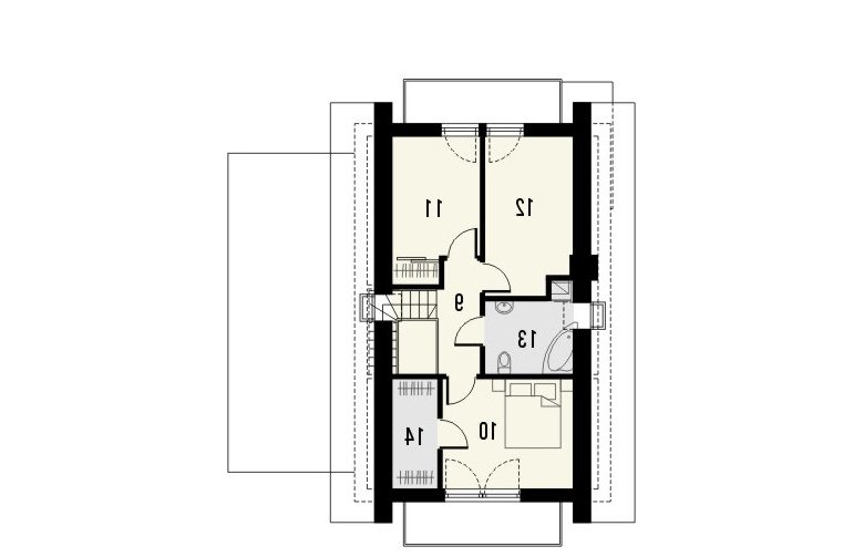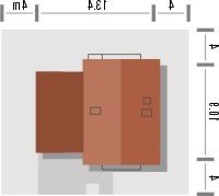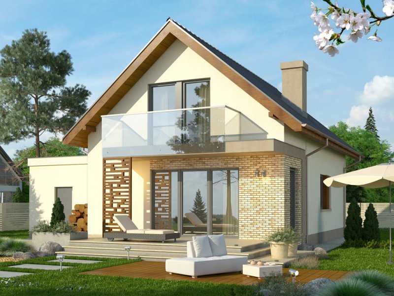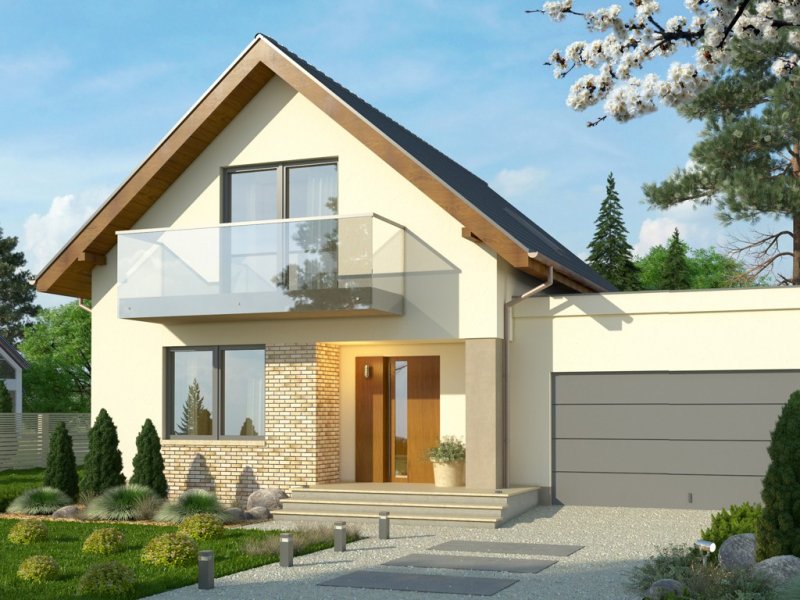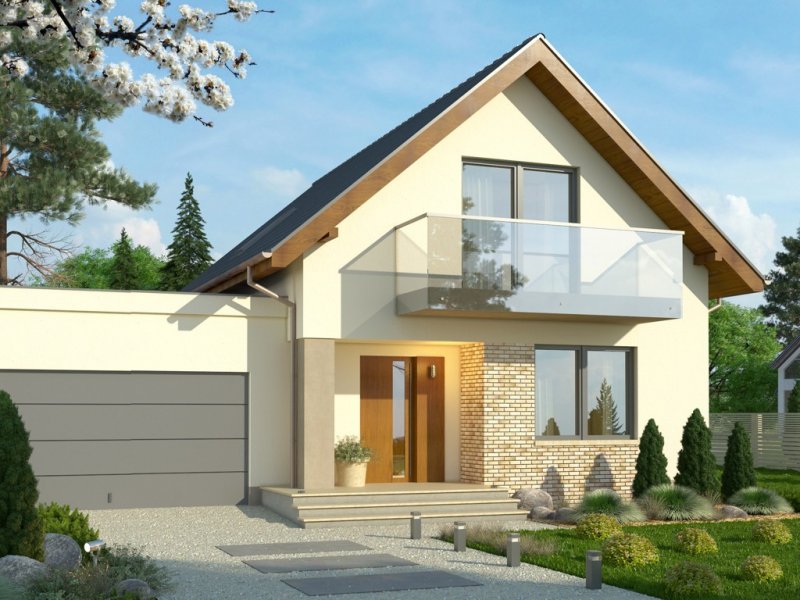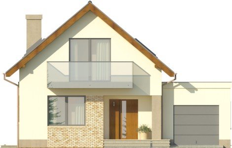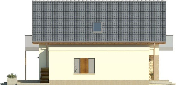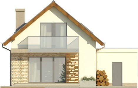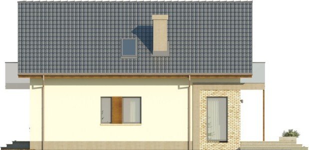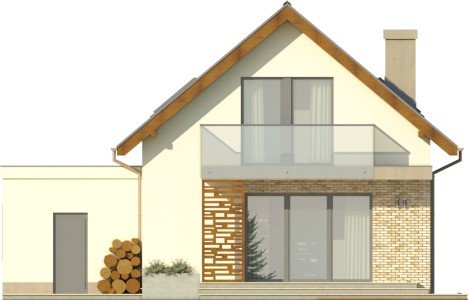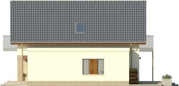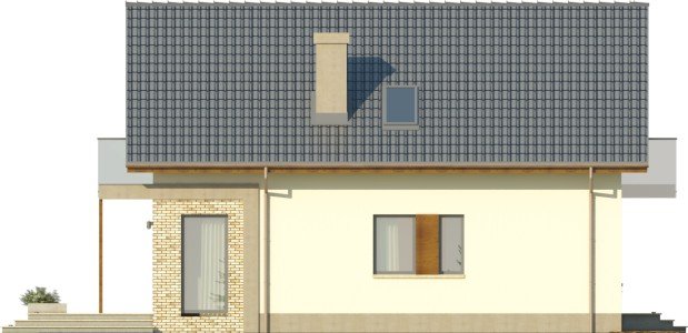 - Prosty dom kryty dachem dwuspadowym. Bryła budynku wyróżnia się dużymi balkonami na ścianach szczytowych. Strefa wejściowa w podcieniu, wyróżniona innym materiałem elewacyjnym.