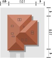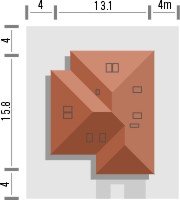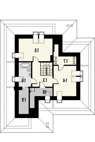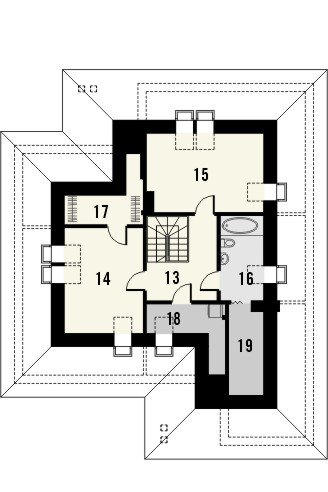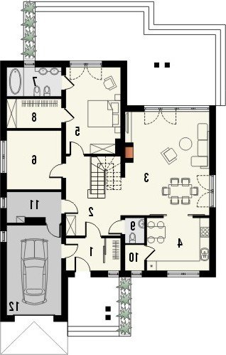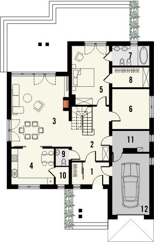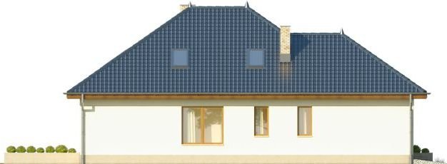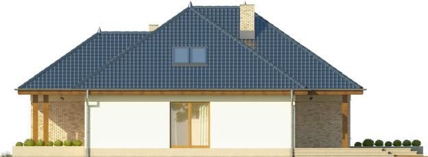 Projekt domu jednorodzinnego zpoddaszem użytkowym z garażem. Na parterze znajduje się salon zjadalnią oraz 2 dodatkowe pokoje. Jeden z nich posiada odrębnąłazienkę i garderobę, a także wyjście bezpośrednio na taras.Kuchnia wyposażona jest w spiżarkę. Z holu dostępne jest wc.Garaż dostępny jest zarówno z wiatrołapu, jak i z holu poprzezpomieszczenie gospodarcze. Na piętrze znajdują się dwa pokoje, wtym jeden z garderobą, łazienka oraz pralnia, a także strych.