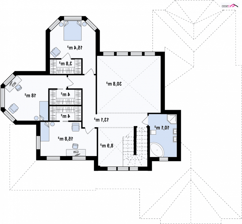 Do nocnej strefy parteru zalicza się również duża sypialnia z dwiema garderobami: „dla niej” i „dla niego” oraz łazienka. Trzy pokoje na piętrze łączy wspólny hol, dzięki któremu pokoje zachowują intymność do pracy lub zabawy. Dwie z sypialń mają wykuszowe okna, nadające smaku i elegancji. Znajduje się tu również wejście na strych do przechowywania sezonowych przedmiotów.