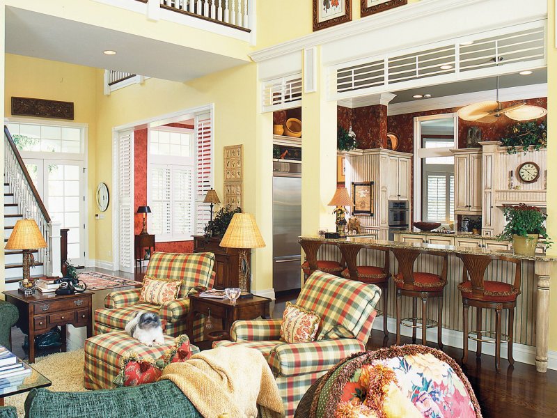 Przestronny salon jest doskonały do spędzania czasu w gronie rodziny oraz przyjaciół. Dwoje drzwi prowadzi na tylny ganek, który dodatkowo powiększa strefę dzienną. Duża i wielofunkcyjna kuchnia z wyspą na środku idzie w parze ze spiżarnią oraz jadalnią. Część kuchni otwarta jest na okazały salon. Na ścianie, obok strzelistego kominka, znajduje się miejsce na powieszenie dużego telewizora.