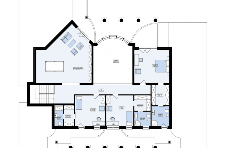 Cała przestrzeń napełniona jest światłem i otwarta na loggię dzięki suwanym ścianom ze szkła. Przestronny zespół bogatych, połączonych pomieszczeń tworzących całość wraz z mnóstwem udogodnień, znakomicie służy właścicielom.