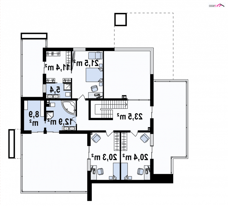 Ogromny atut w projekcie Zx127 stanowi antresola z dużymi pionowymi przeszkleniami. Dzięki nim możemy hodować tu większą ilość roślin, które sprawią, że z przyjemnością będziemy „bujać w obłokach” przed kominkiem zaczytani naszymi ulubionymi gatunkami literackimi.