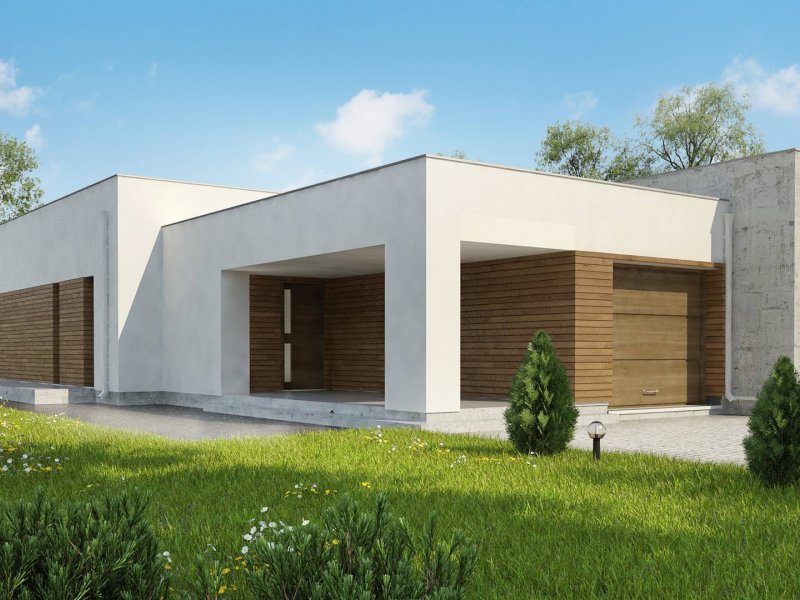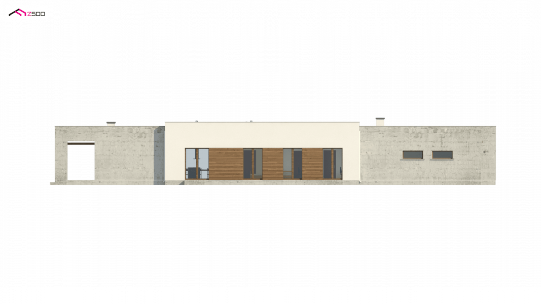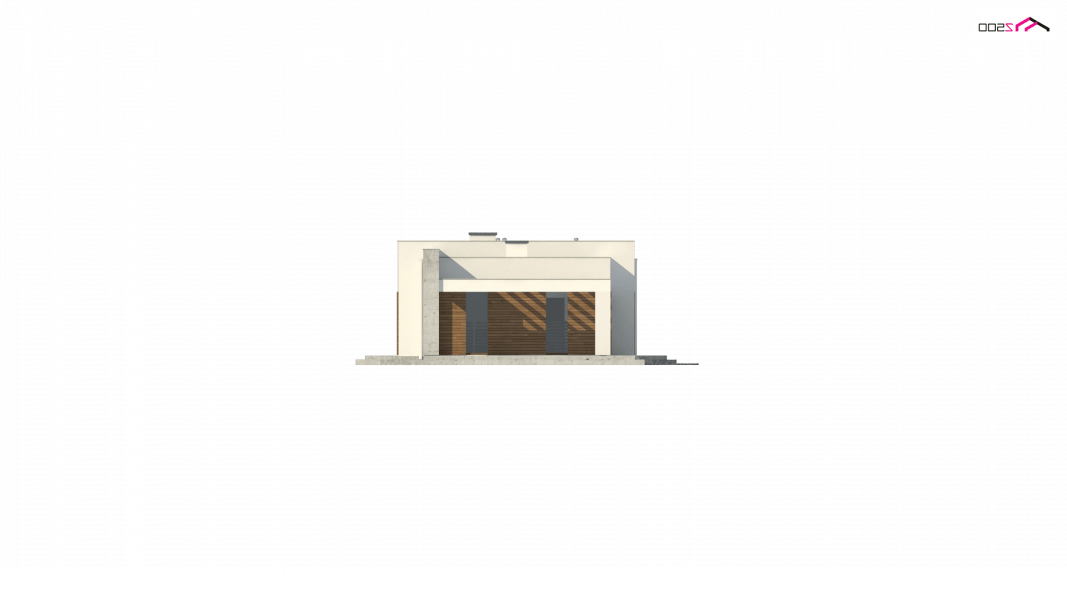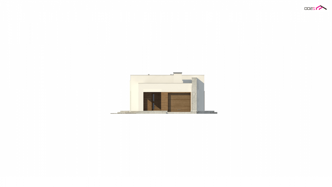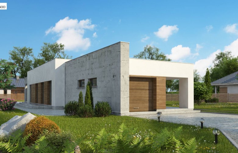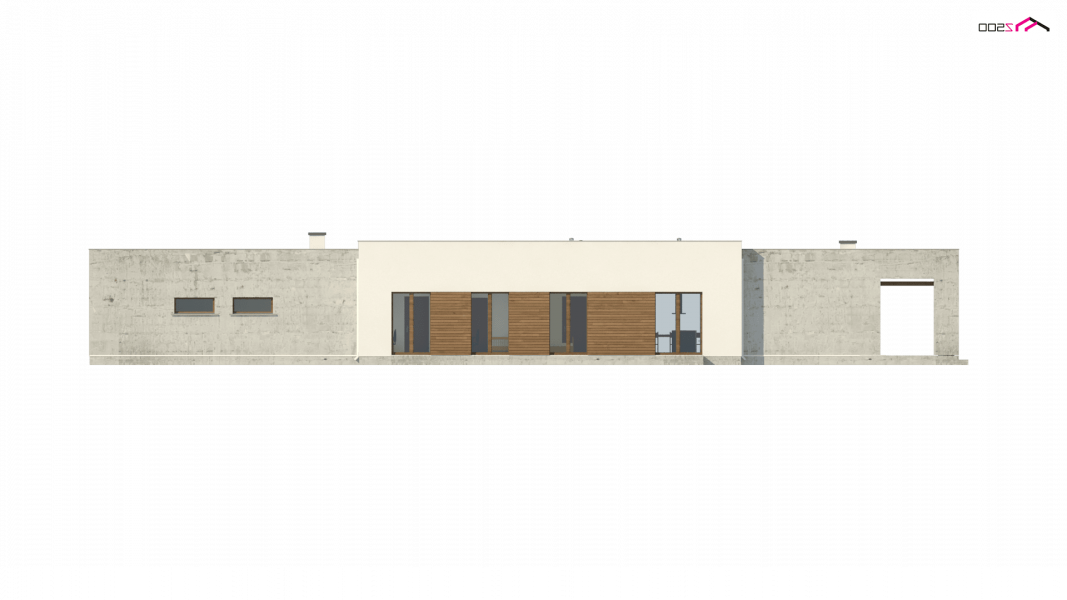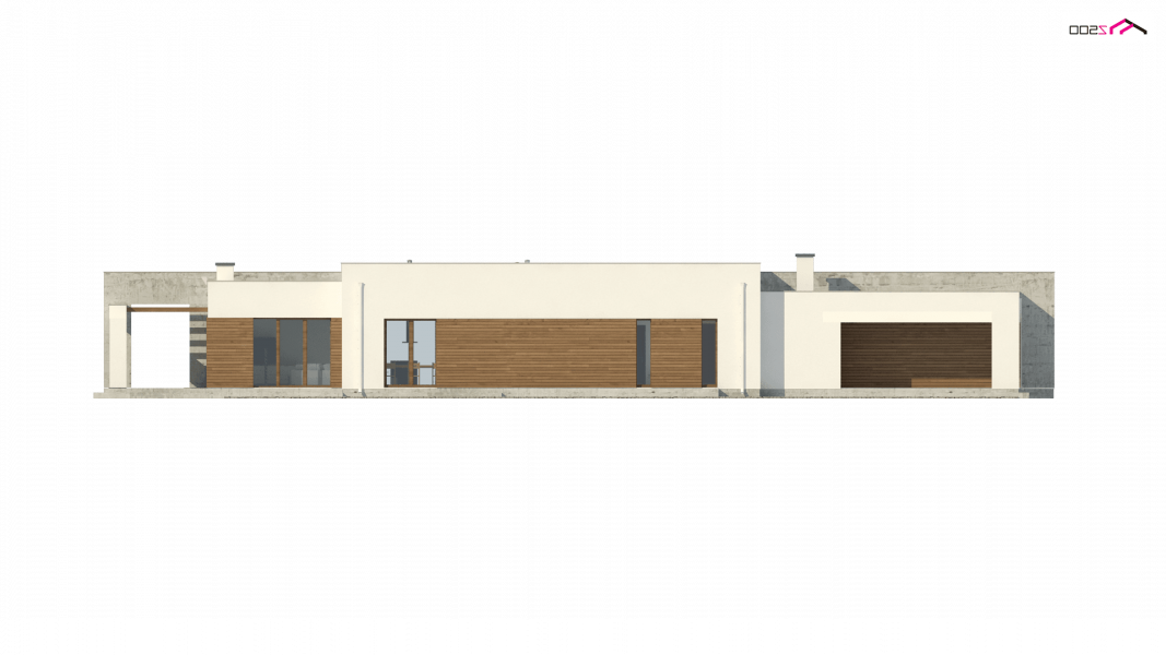 Nowoczesna minimalistyczna bryła i surowość architektury wyrażone są w podłużnej, zwartej bryle bez ozdób oraz w pokryciu dachem płaskim. Beton architektoniczny i drewniana okładzina spełniają funkcję elementów wykończeniowych.