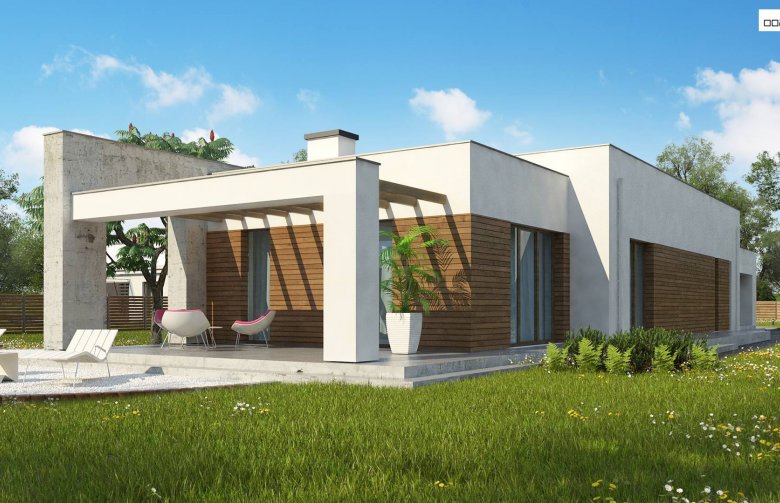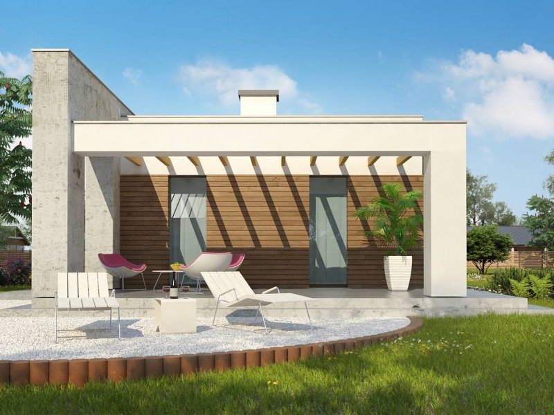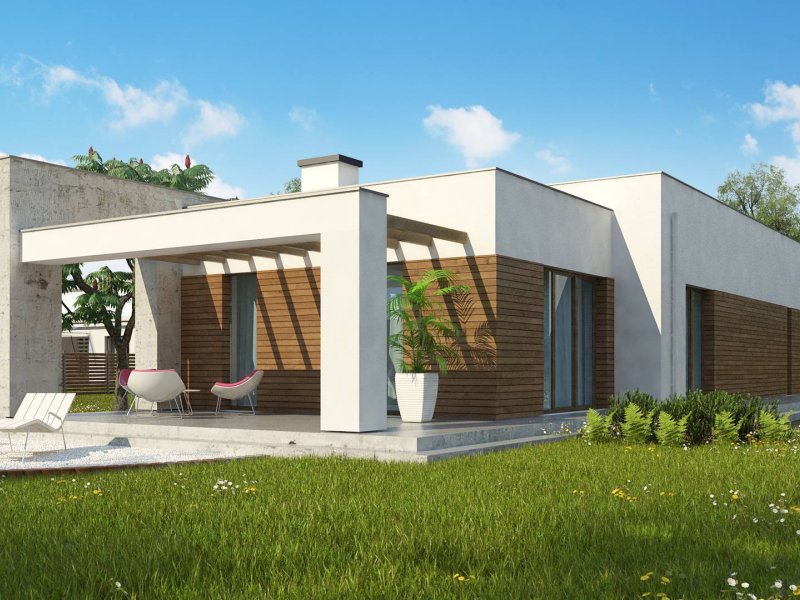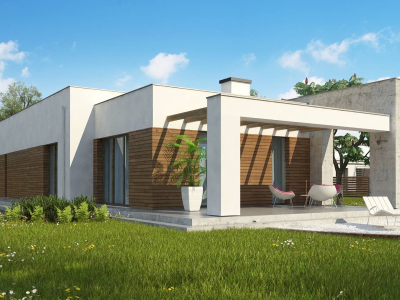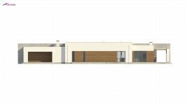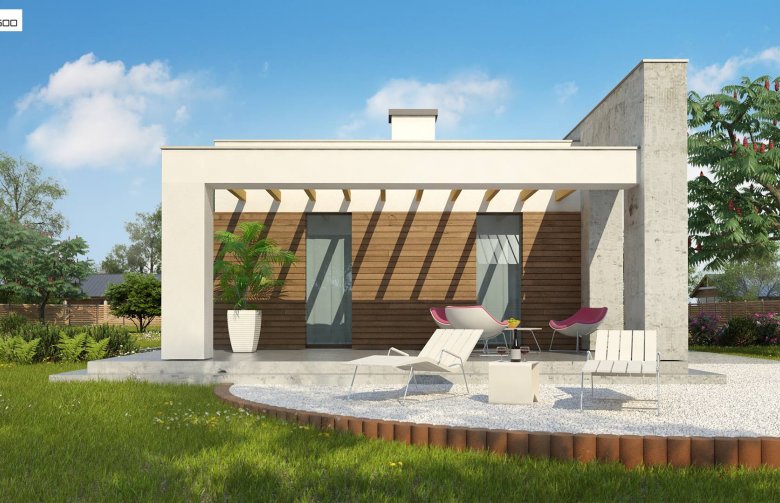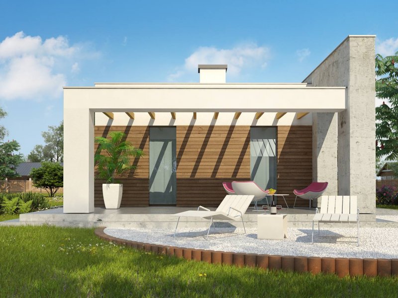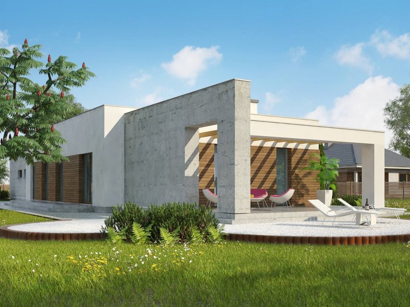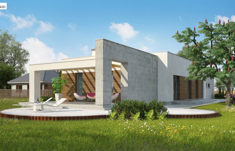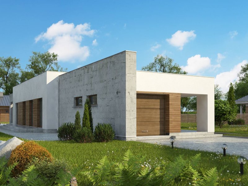 Nowoczesna minimalistyczna bryła i surowość architektury wyrażone są w podłużnej, zwartej bryle bez ozdób oraz w pokryciu dachem płaskim. Beton architektoniczny i drewniana okładzina spełniają funkcję elementów wykończeniowych.